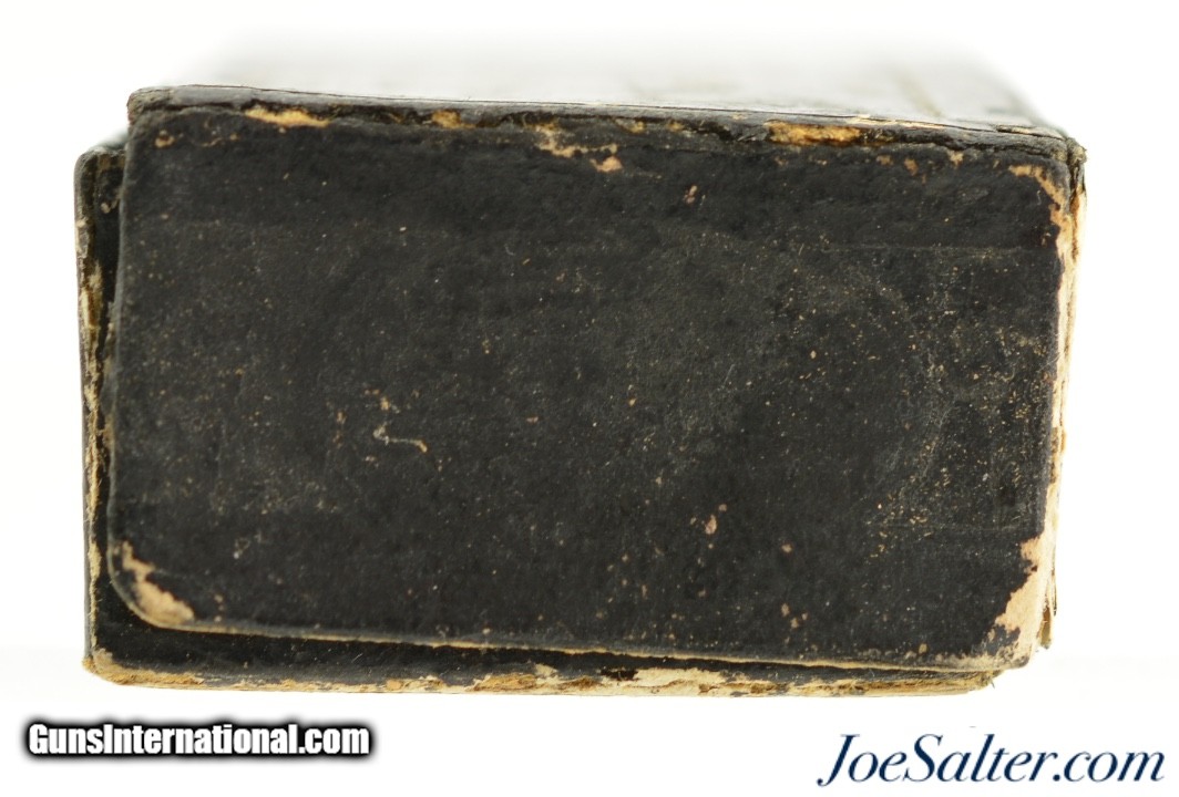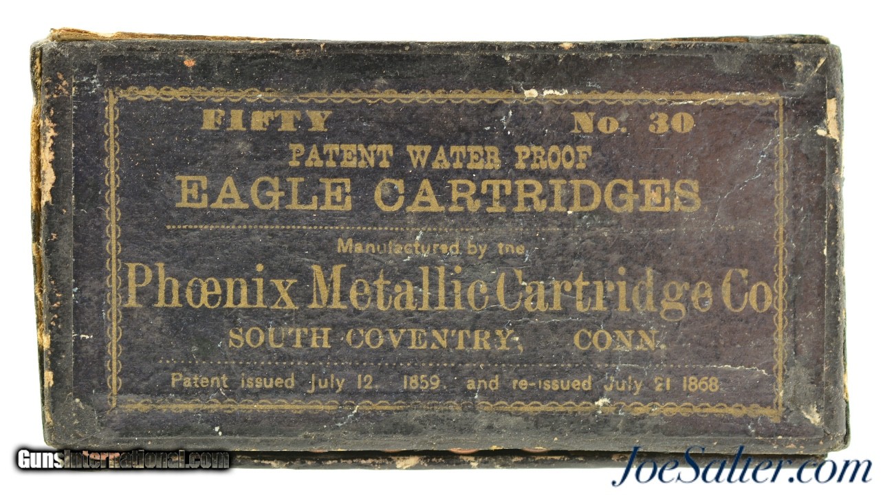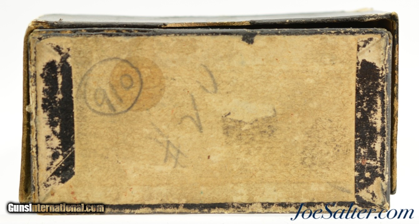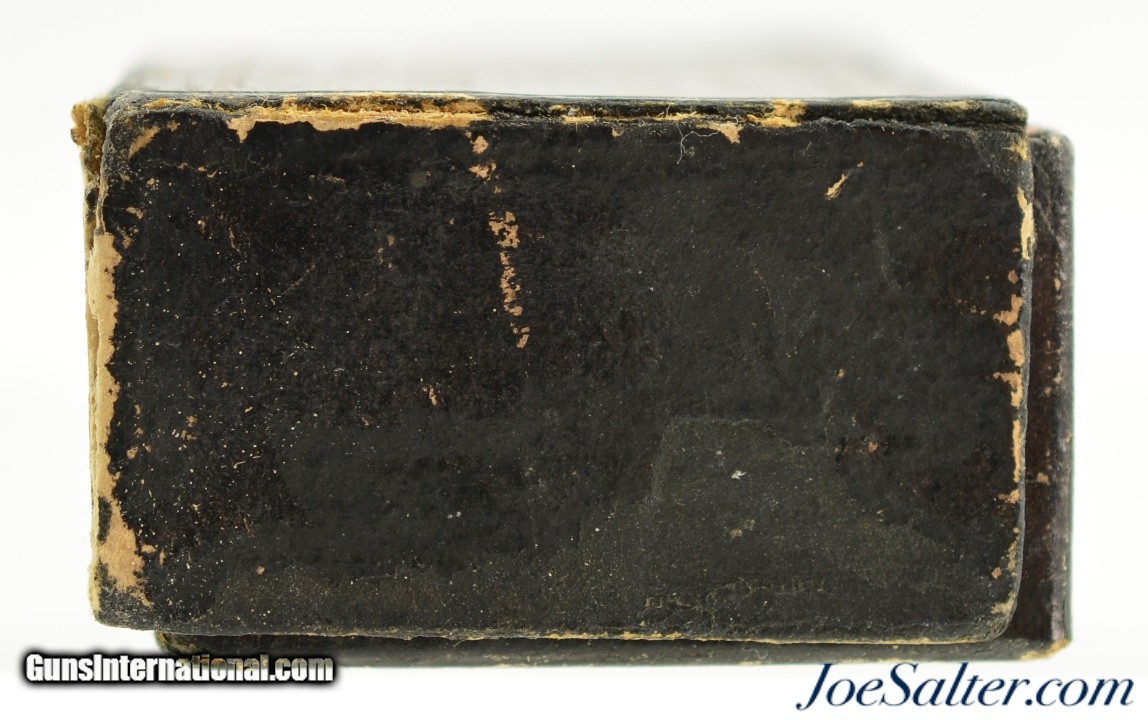 Description: This is a full box, 50 original rounds, of .30 Cup Fire ammunition manufactured by the Phoenix Metallic Cartridge Company in South Coventry, Connecticut. Built for the Eagle Arms Company which produced a front loading pocket revolver sold under Plant Mfg. The unique cartridges were designed to circumvent the Rollin White patent and offered a unique alternative. The box reads: " FIFTY NO. 30 / PATENT WATER PROOF / EAGLE CARTRIDGES" with patent dates of July 12, 1859 and July 21 1868. The black two piece box shows repairs to the bottom and top sections with a missing side on the latter. The side that is missing is on the bottom and the box is solid and displays well on shelf. Cartridges have the recessed "P" head stamp and are native to the box and in near excellent condition with some verdigris and bullet lube oxidation. The black label with gold type remains in excellent, crisp condition and will look fantastic on display. A rarely seen full box to pair with your antique revolver. Price: $995.00 Contact Seller |