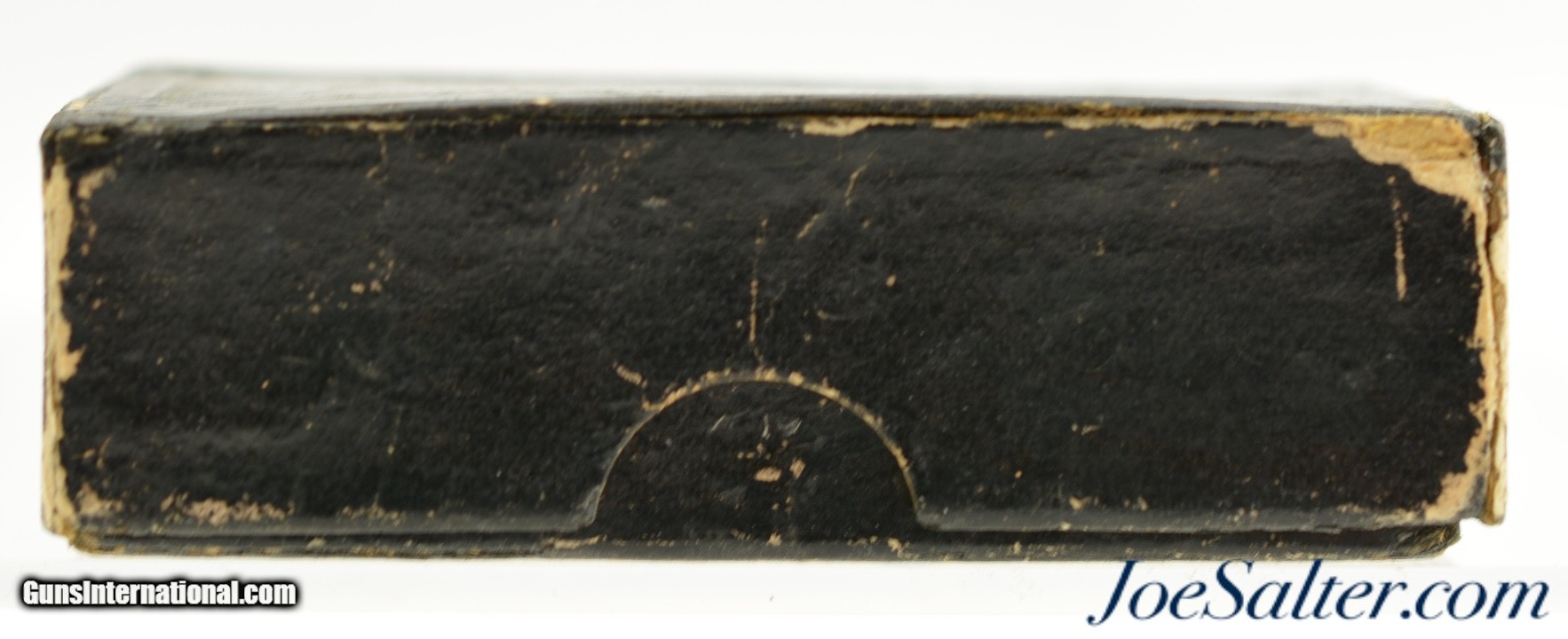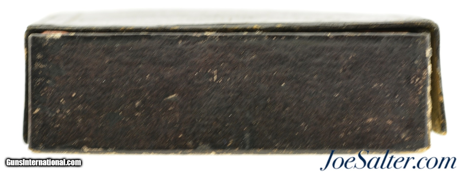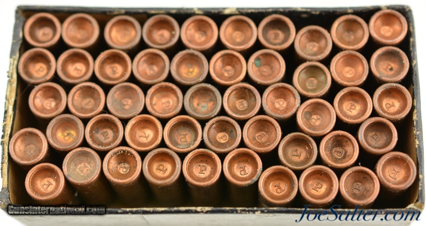 Description: This is a full box, 50 original rounds, of .30 Cup Fire ammunition manufactured by the Phoenix Metallic Cartridge Company in South Coventry, Connecticut. Built for the Eagle Arms Company which produced a front loading pocket revolver sold under Plant Mfg. The unique cartridges were designed to circumvent the Rollin White patent and offered a unique alternative. The box reads: " FIFTY NO. 30 / PATENT WATER PROOF / EAGLE CARTRIDGES" with patent dates of July 12, 1859 and July 21 1868. The black two piece box shows repairs to the bottom and top sections with a missing side on the latter. The side that is missing is on the bottom and the box is solid and displays well on shelf. Cartridges have the recessed "P" head stamp and are native to the box and in near excellent condition with some verdigris and bullet lube oxidation. The black label with gold type remains in excellent, crisp condition and will look fantastic on display. A rarely seen full box to pair with your antique revolver. Price: $995.00 Contact Seller |