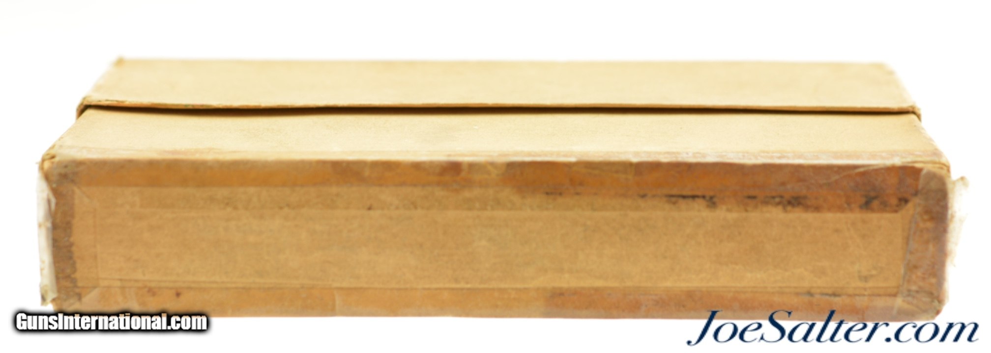 Description: This is a full box, 20 original rounds, of .38-70 W.C.F. black powder ammunition manufactured by Winchester with 255 grain bullets. Dating to the mid 1890's the two piece, square corner box is in very good condition with the wrap around label having a very nice cartridge cut and very good graphics overall with some flaking and edge wear. The bottom portion of the box shows older tape repairs and some age soiling. The cartridges are in excellent condition. Price: $295.00 Contact Seller |