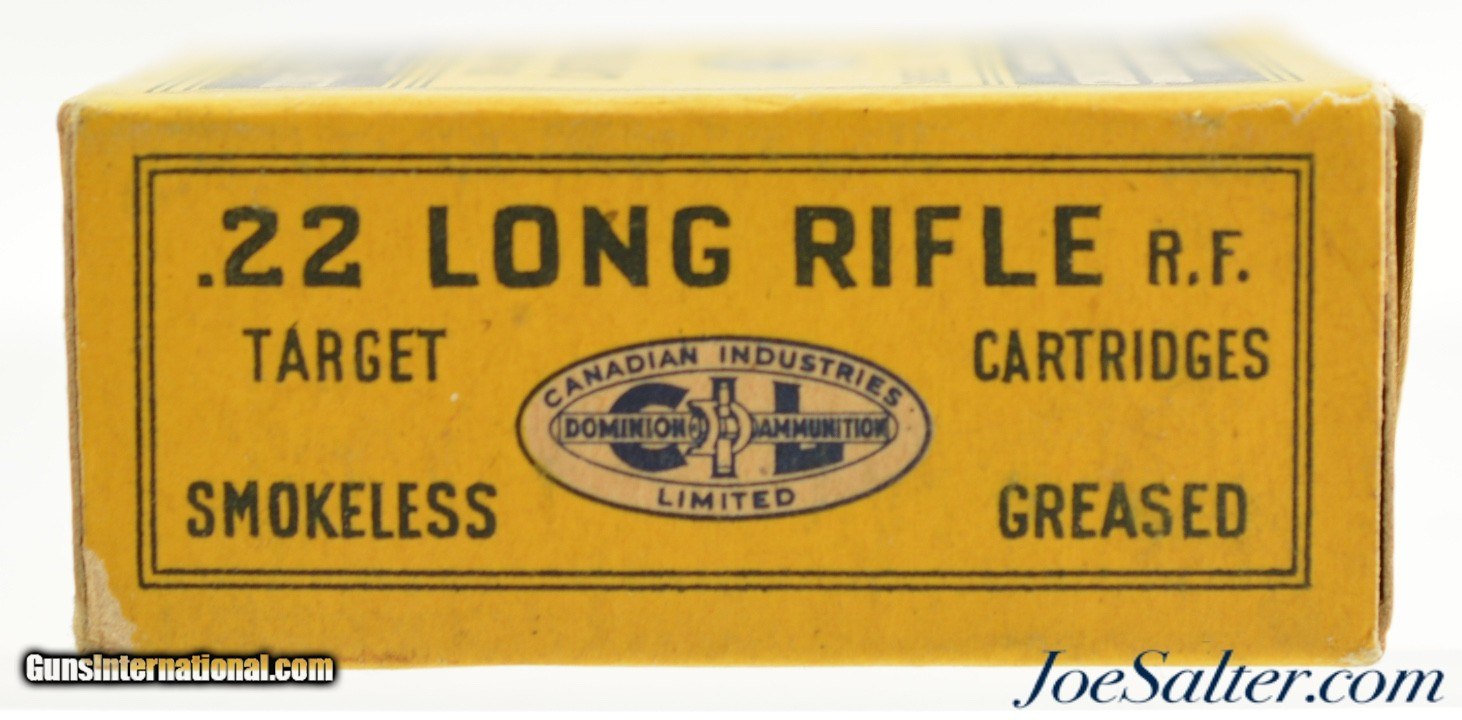 Description: This is a full box, 100 original rounds, of .22 LR ammunition manufactured in Canada by Canadian Industries Limited (C-I-L) with smokeless, greased cartridges. Box shows some light shelf and handling wear. This ammo was used for training the Canadian Military in WW2. ; Price: $75.00 Contact Seller |