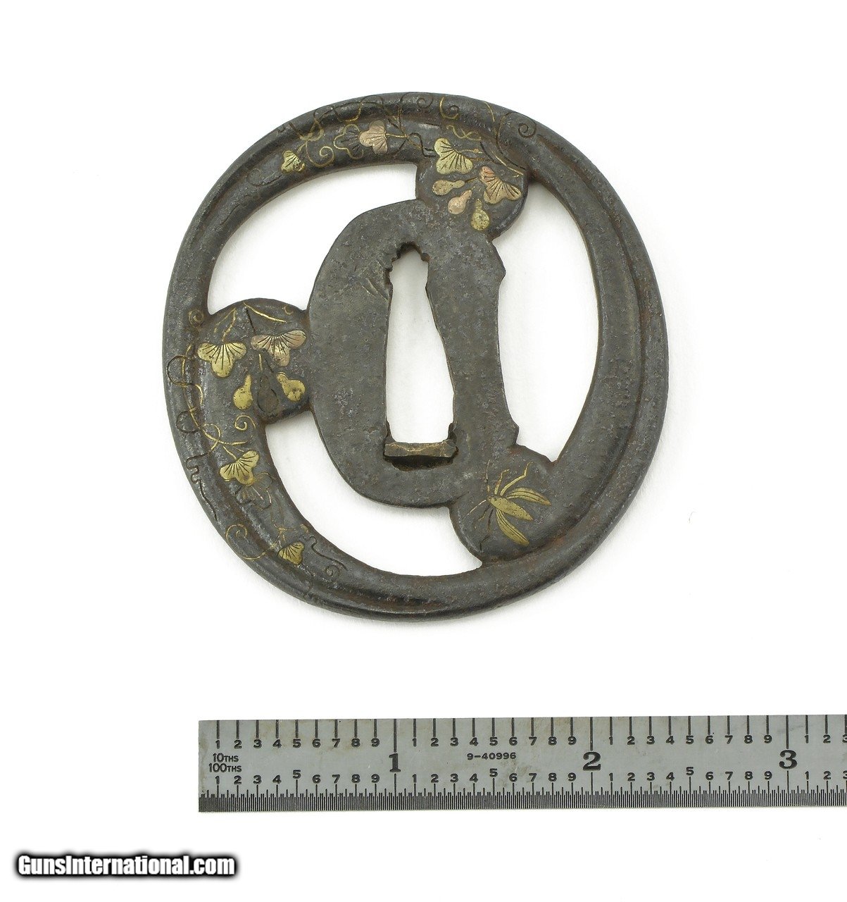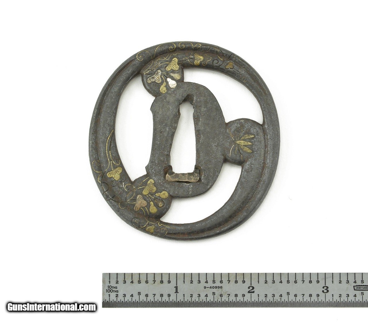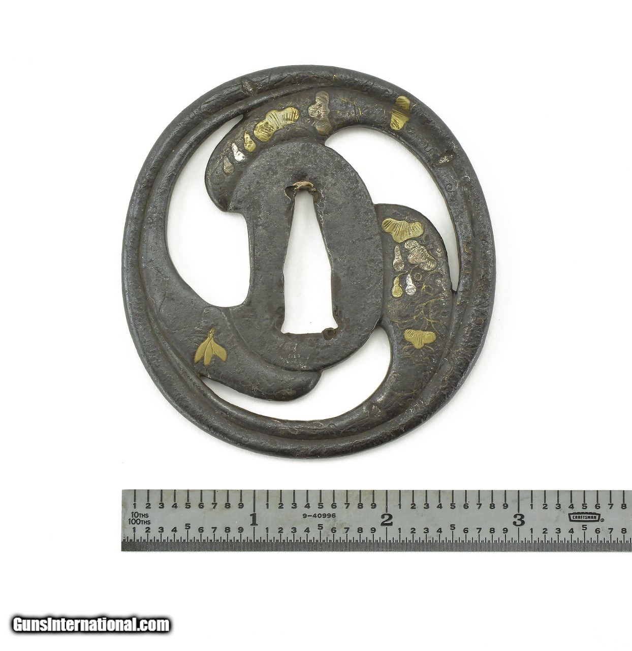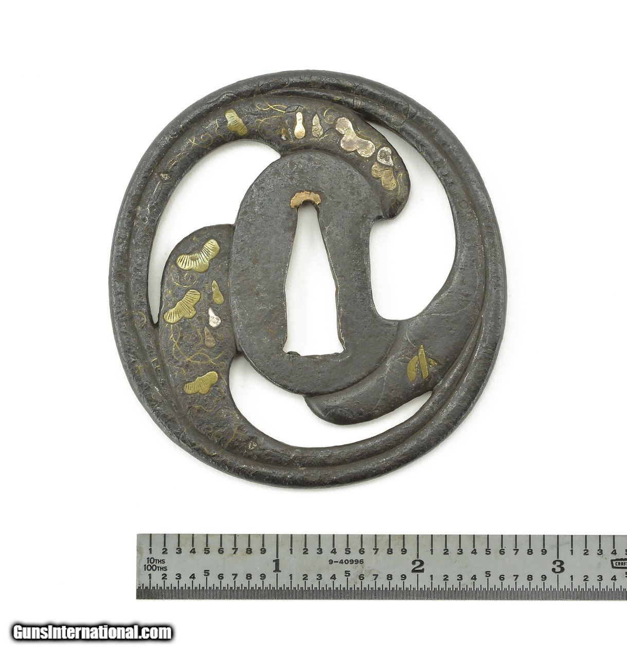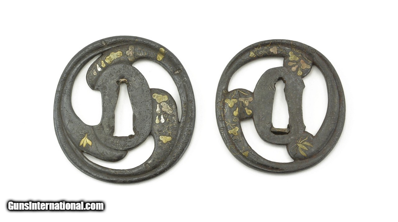 Description: "Dai-Sho Tsuba. Iron with floral inlay of brass and silver. Dai vertical measurement is 3" (7.8cm.). Sho is 2 ¾" (7cm.) Price: $575.00 Contact Seller |