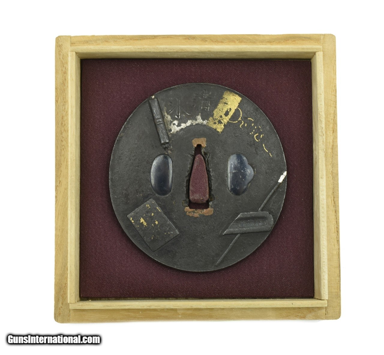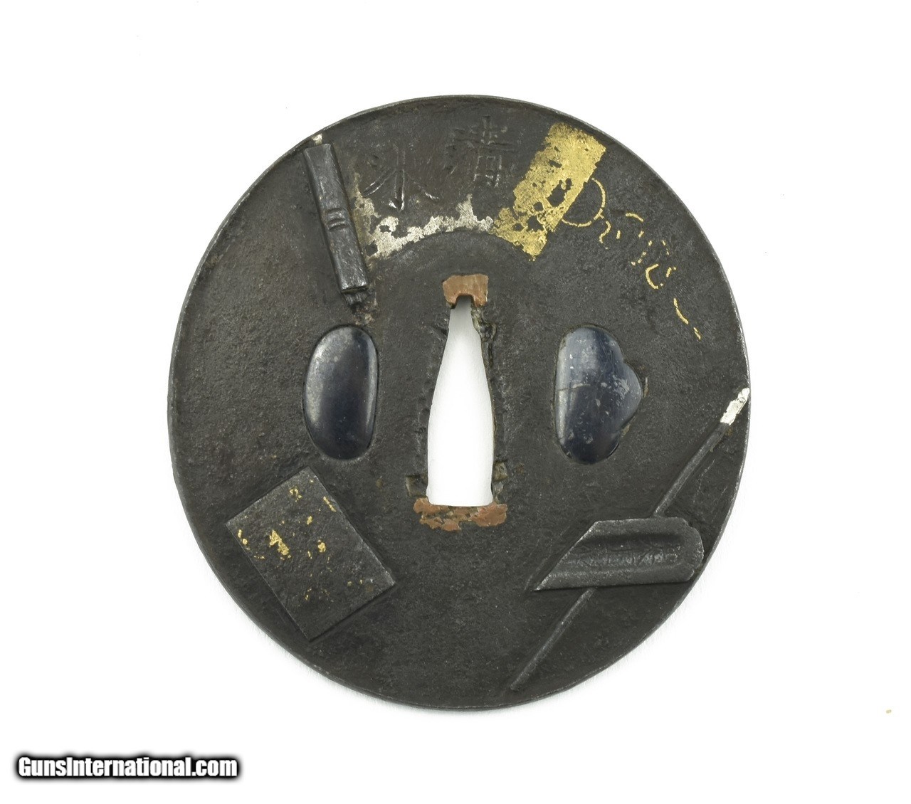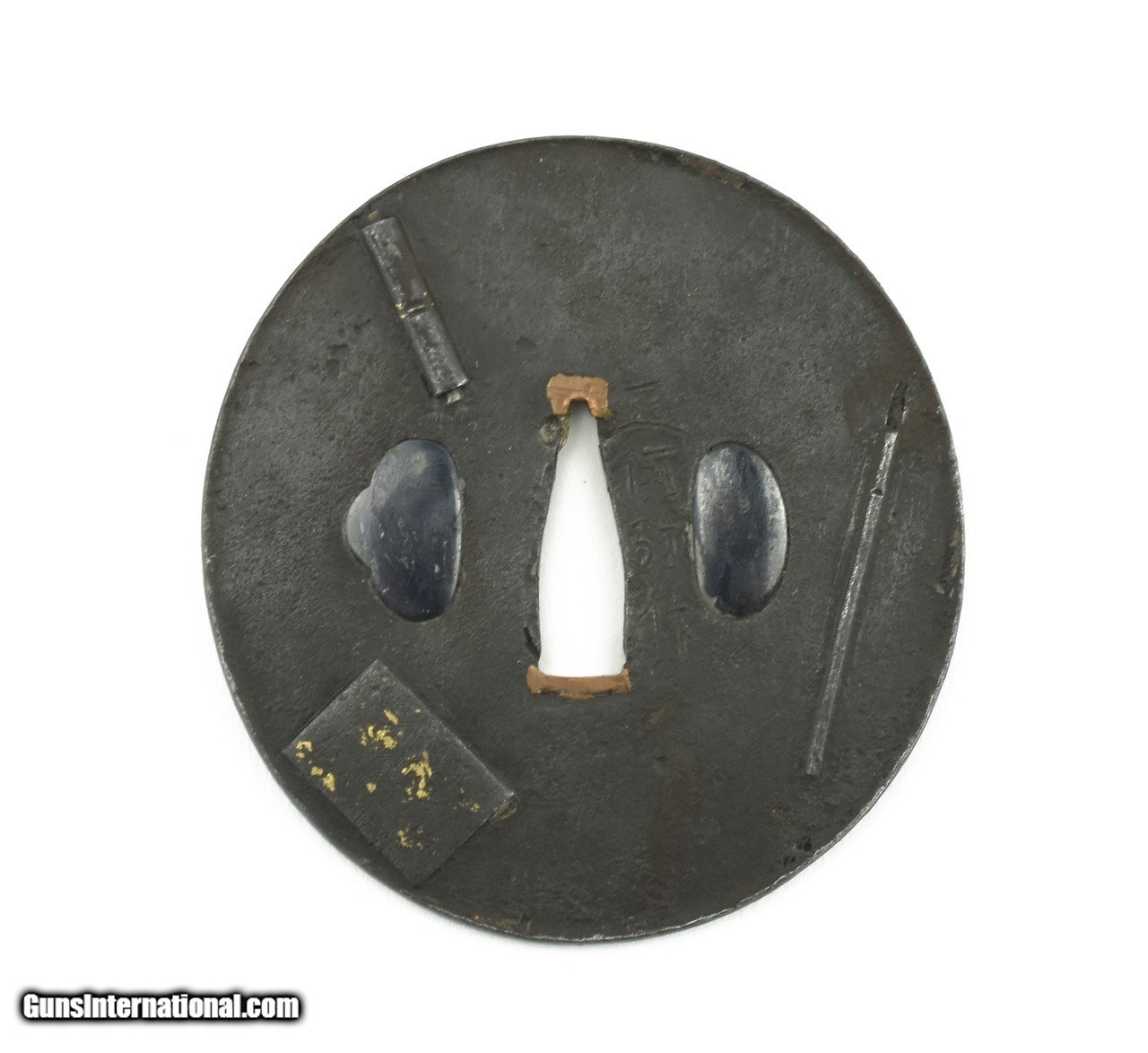 Description: "Iron Tsuba. Theme of scroll with brushes. Signed. Vertical height 3 ¼" (8 cm). Katana size. Price: $265.00 Contact Seller |
