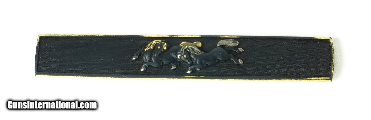 Description: "Kinko Kodzuka. Shakudo nanako ground. High relief horses in shakudo with gold and silver highlights. Signed: Goto Mitsu…(Kao). Nanako is somewhat worn and gold on edges and reverse shows some wear from the kodzuka pocket. Price: $495.00 Contact Seller |