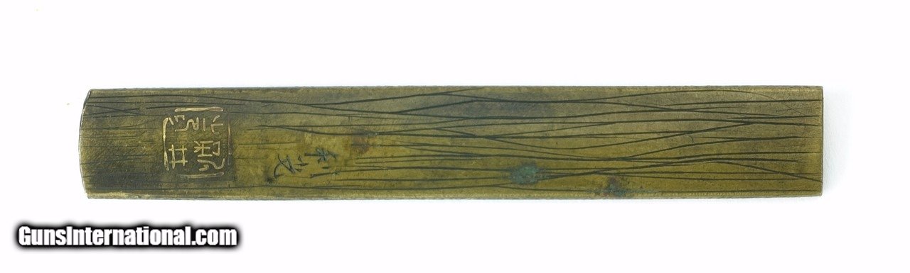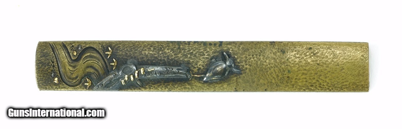 Description: "Kinko Kodzuka. Copper stone ground. Shakudo bird standing on small tree beside flowing stream. Gold and copper highlights. Signed with large Kao on reverse with cat-scratch striations. Price: $300.00 Contact Seller |