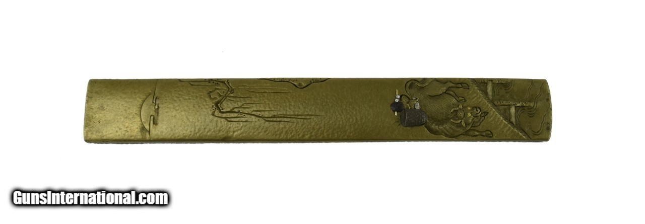 Description: "Kinko Kodzuka. Shibuichi stone ground finely carved ox bearing containers with shakudo and silver highlights. Ox is on bridge with setting sun in background. Signed: Naga Mitsu with Kao. Price: $425.00 Contact Seller |