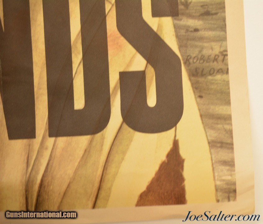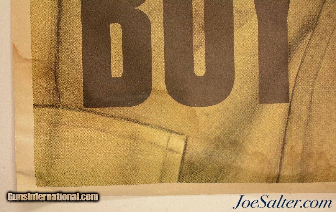 Description: This is an original WWII poster issued in 1943 to support the War Bond drives. Featuring a wouned soldier this poster measures 28 ½" x 40". Created by Robert Sloan it was produced by the Government Printing office with the following code "1943-O-502782 WSS 715". The condition is very good with excellent, crisp grpahics. Some light creases are evident from folding and minor staining along the bottom edge and overall minor edge wear. The back of the poster shows two four inch sections of double sided tape where the poster had been attached to a display board along the top edge and staining in the bottom left corner. A great original poster.; Price: $159.00 Contact Seller |