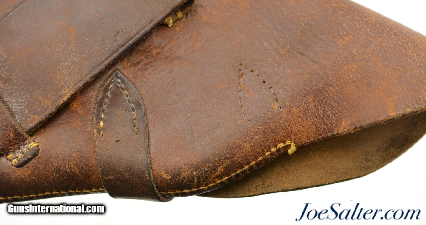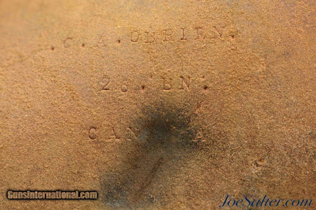 Description: This is a leather flap holster for the Webley MK III and similar revolvers. The private purchase holster is marked only with what appears to be a Soldiers name "C.A. Obrien / 26 BN / CANADA" on the inside flap possibly from the 26th Infintry Battalion. The overall condition is very good with the leather supple with light use marks, a small perforation on the lower barrel section and some verdigris on the brass studs. An interesting holster worthy of further research. Price: $185.00 Contact Seller |