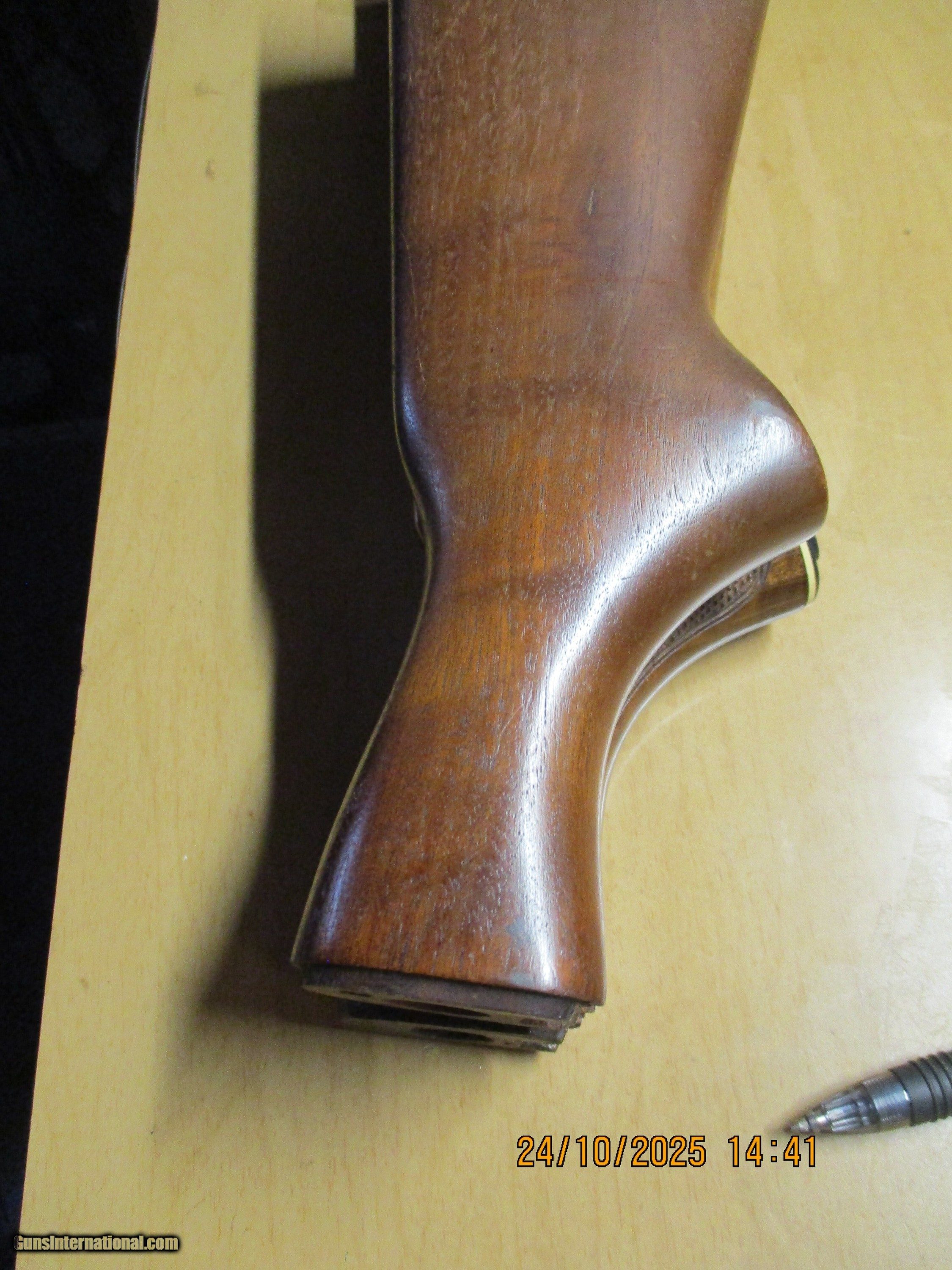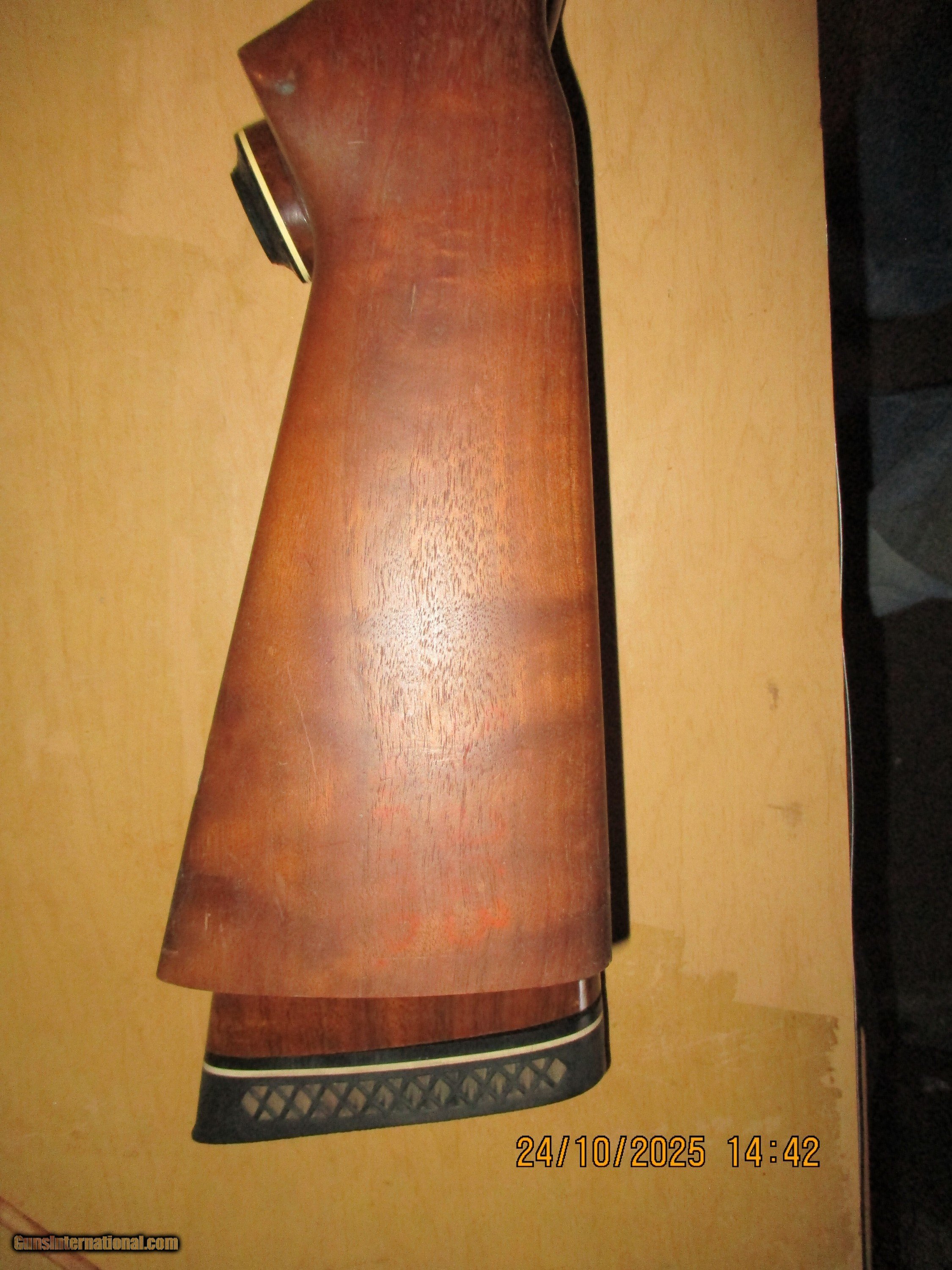 Description: We have a very nice stock that will fit any of the above model Remington shotguns, exceptional figure. There appears to be a repair/ small defect just behind the triggerguard cutout- and a few scratches, very light in nature. Price includes shipping to lower 48 The last four pictures show the comparison with a factory Remington stock and it shows the drop is fairly close to factory specs. There is enough wood to change the angle slightly for more or less drop at comb. Price: $180.00 Contact Seller |