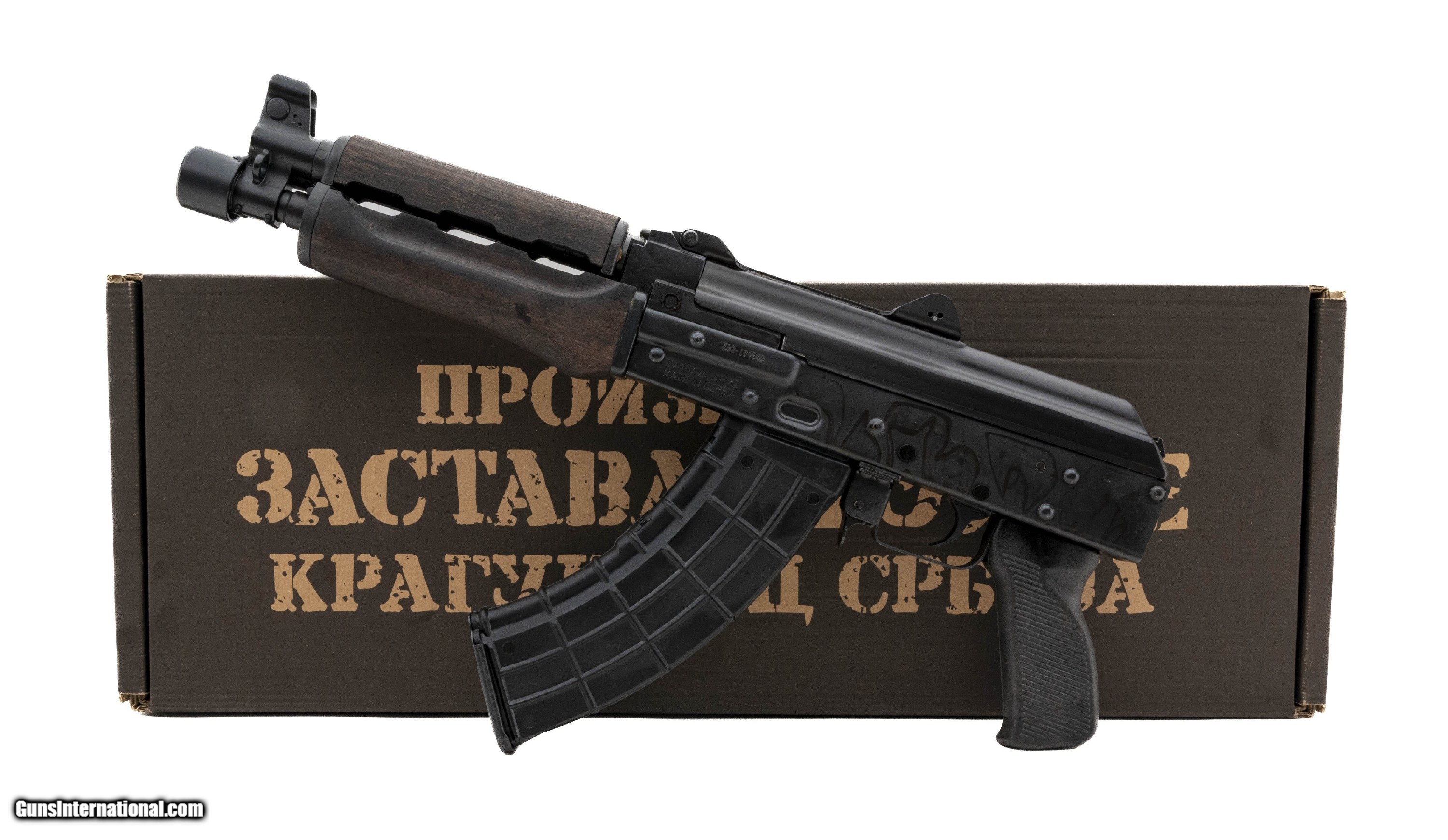 Description: "Serbian Made Yugo Pattern AK Pistol with an 10"" Chrome Lined Barrel. Blued Finish, Wood Handguard, Bulged Trunnion, Hinged Dust Cover w/ Bolt Catch Safety Selector. Includes 1-30rd Magazine. NEW. UPC: 685757098182 (STOCK PHOTO) SOLD |