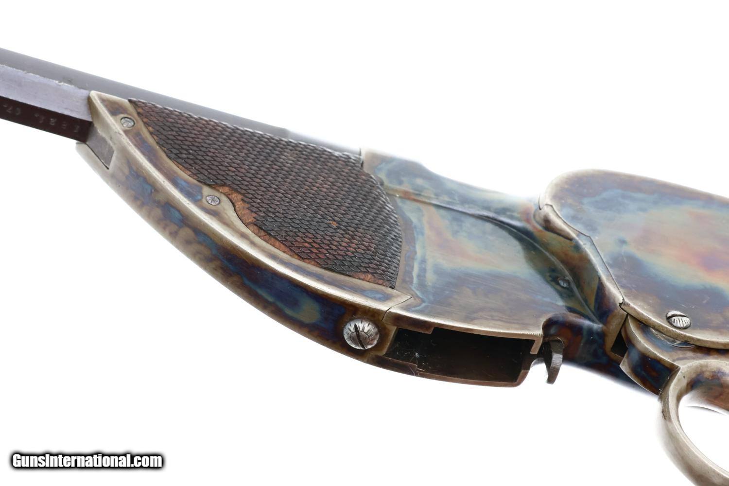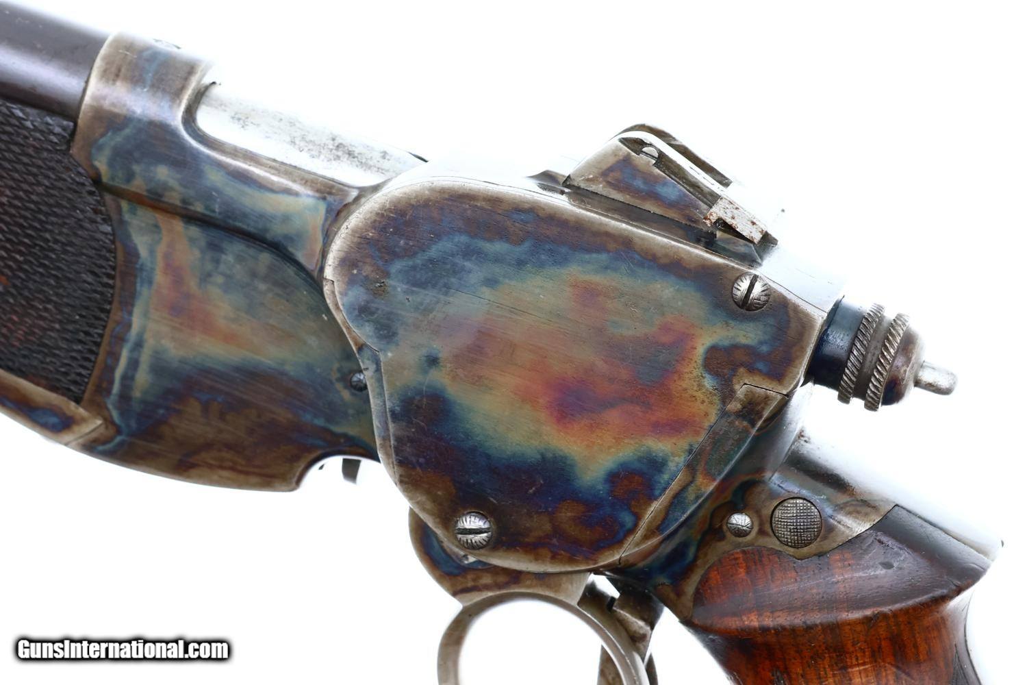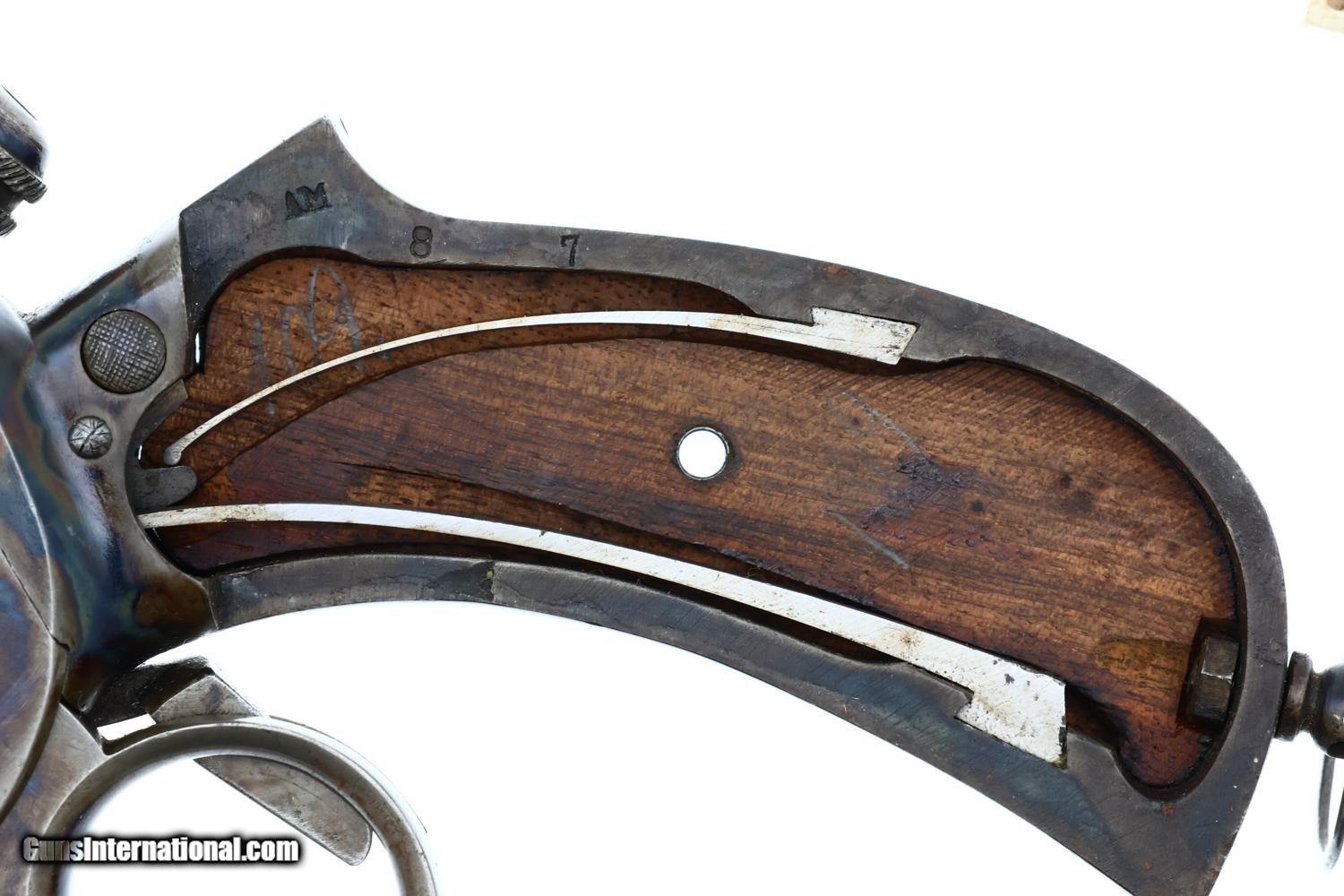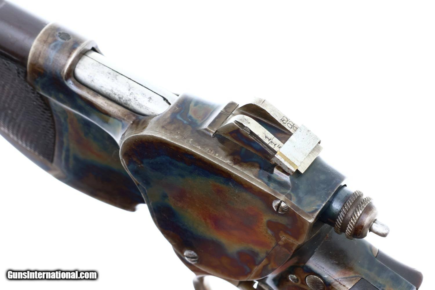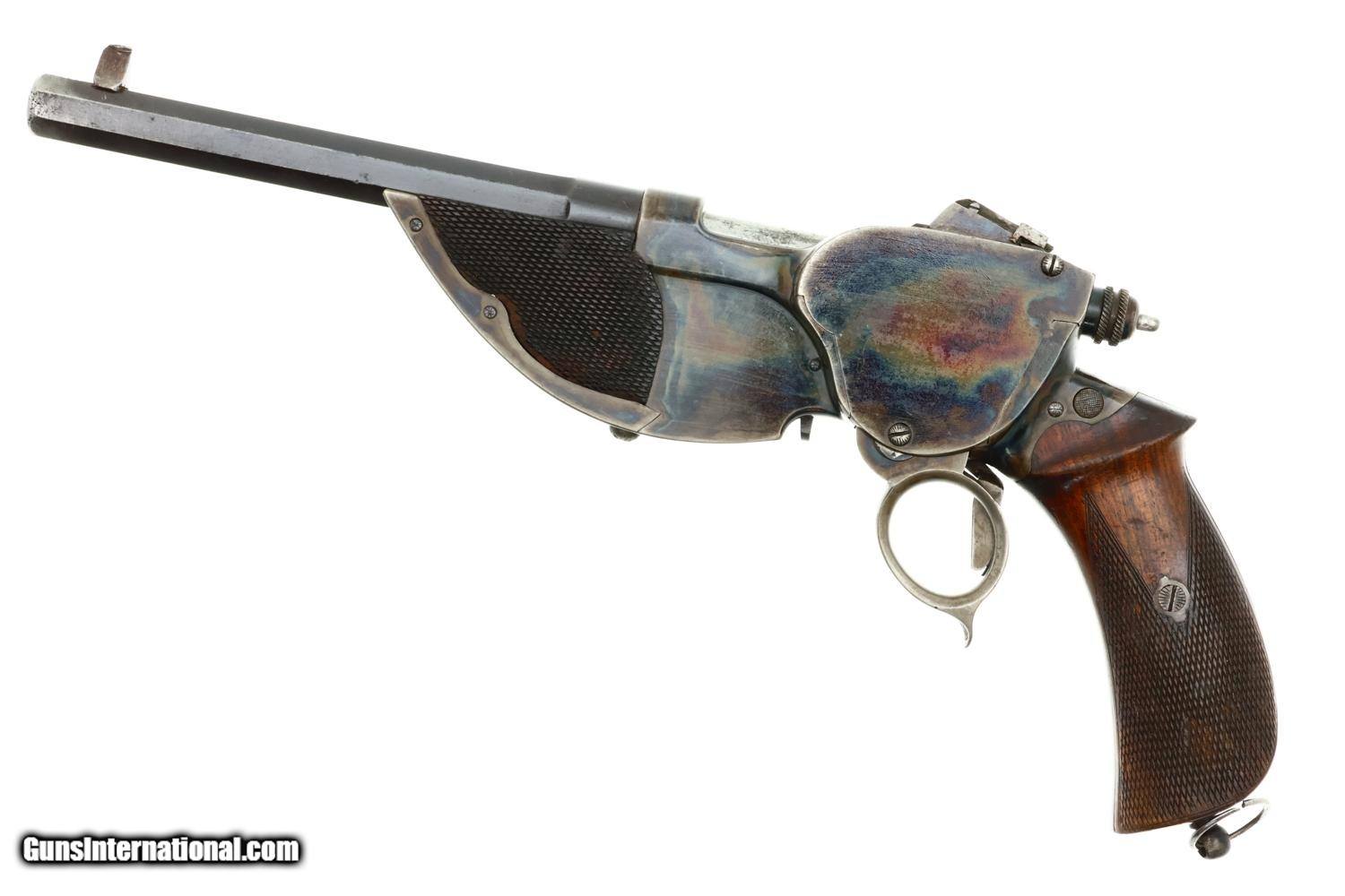 VG -EXC original condition with the barrel retaining most of its original brown finish, thinning and etching on top and near the muzzle. The case hardening is wonderfully vibrant on both sides of the receiver and frontstrap. Faded fire blue on front sight and dulling of case colors around ring and backstrap. Comparable condition wood with staining and handling marks as carefully photographed. Partial lanyard ring. Repeater action is crisp, with a strong return spring. Bright bore with deep rifling. A very nice example of a rare and classic repeater pistol, Europe's counterpart to the Volcanic, whose brief production set the stage for the soon-to-appear semiautomatic pistols!