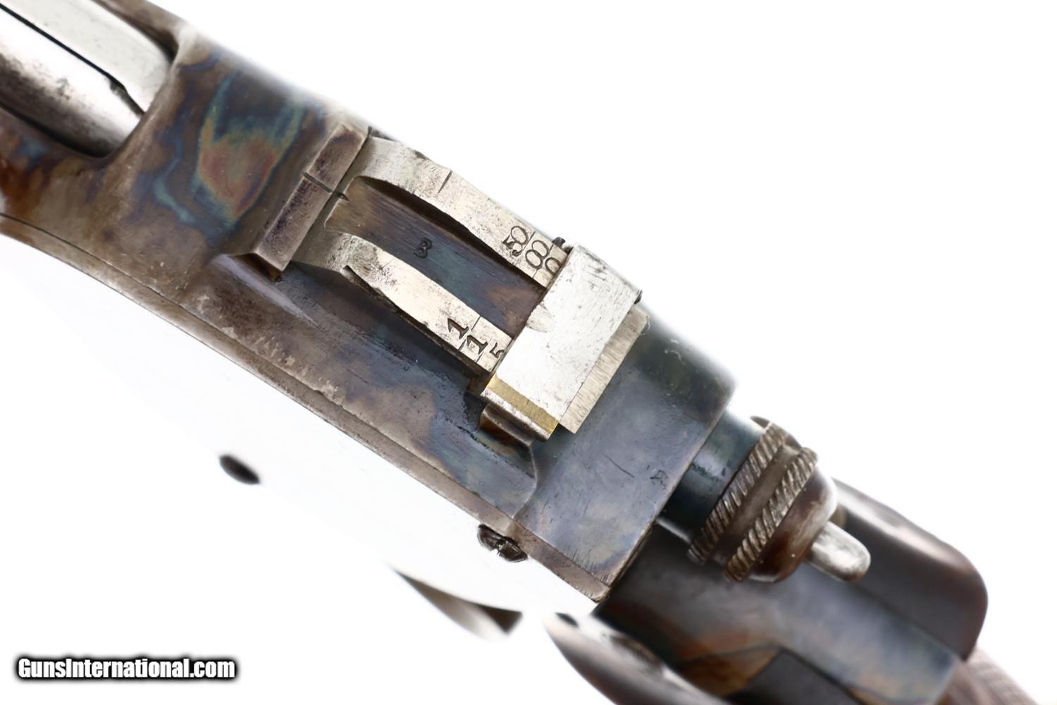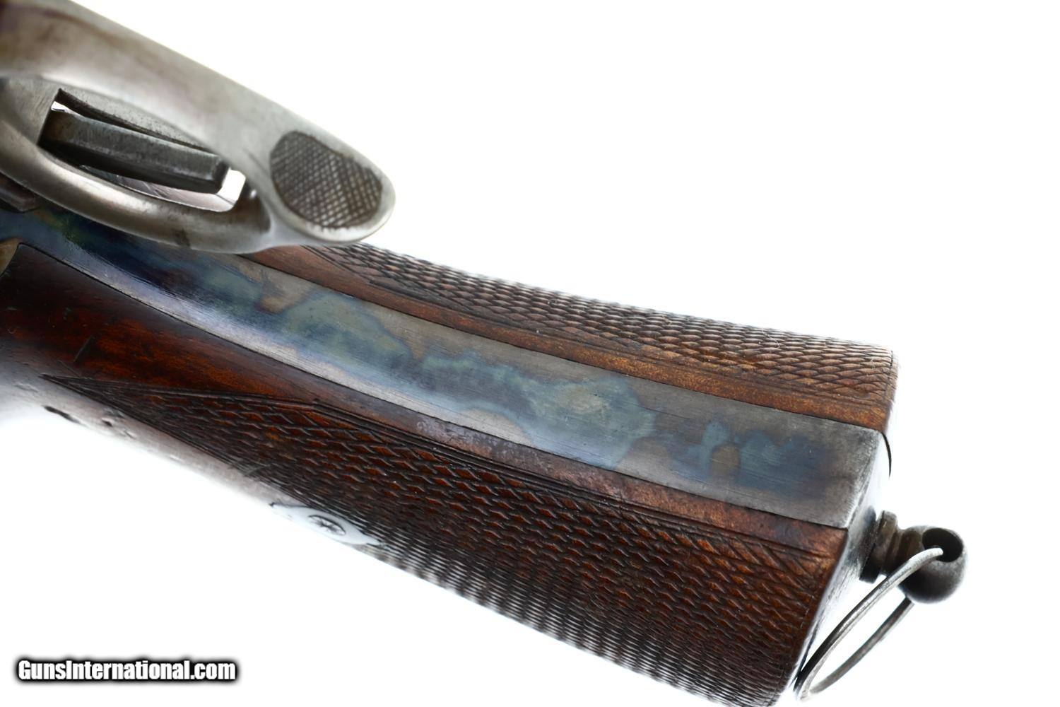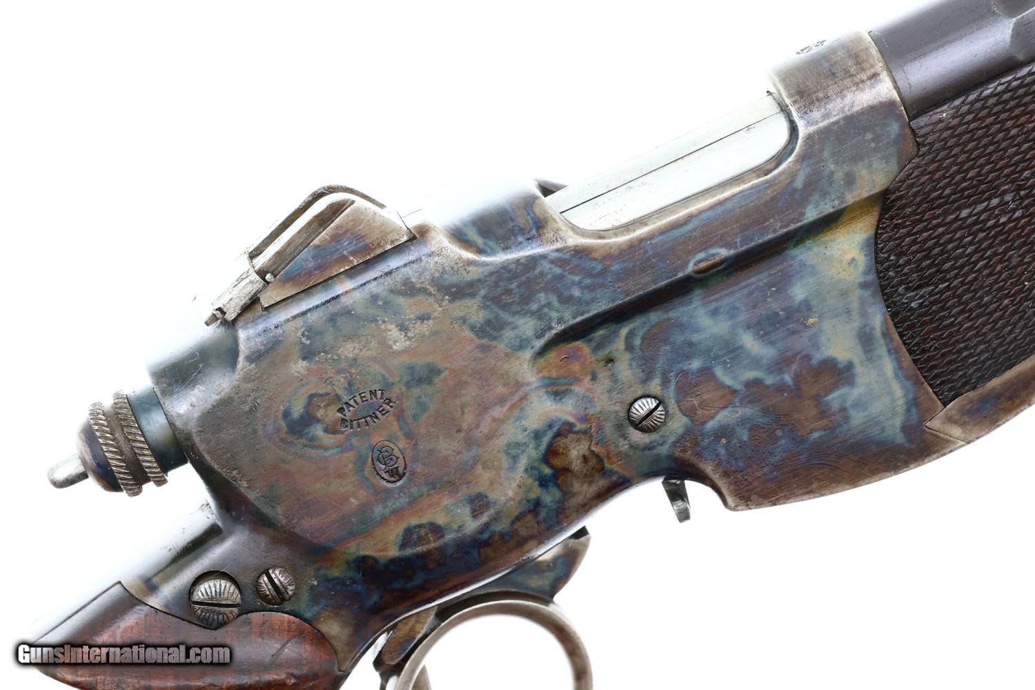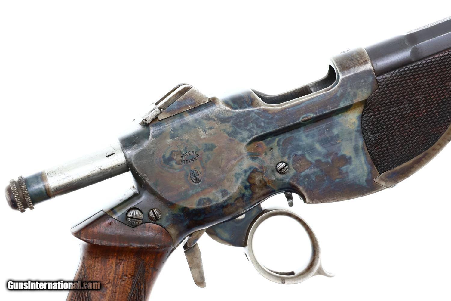 This repeating pistol was made in Austria, beginning in 1896, and chambered for the proprietary 7.7mm Bittner cartridge. As the guns were serialed internally, an issue overlooked by most authors, production numbers have been cited from a low of 500 to a high of nearly 3000. The confusion usually relates to the markings under the barrel, that reflect the pistol's sequence in Vienna's proof house. This one, #87 on frame under grip, not disassembled, was Austrian proof numbered 1821 and dated 1897. As true for all Bittners, it is chambered for the 7.7mm cartridge and has a 6” largely octagonal barrel, round where it meets the receiver, with a matted top surface. Fitted with a fixed bi-concave front sight and a cursive rear sight graduated from 50, 100, and 150 meters. The top of the receiver is marked with the Austrian eagle. The right side of the receiver “PATENT BITTNER” over the encircled trademark. Virtually all components of the pistol were color case hardened except the barrel that was originally browned and the sights that were fire blued. A checkered walnut insert is in the forend. Checkered walnut grips secured with a single transverse screw. At the base is a lanyard ring.
