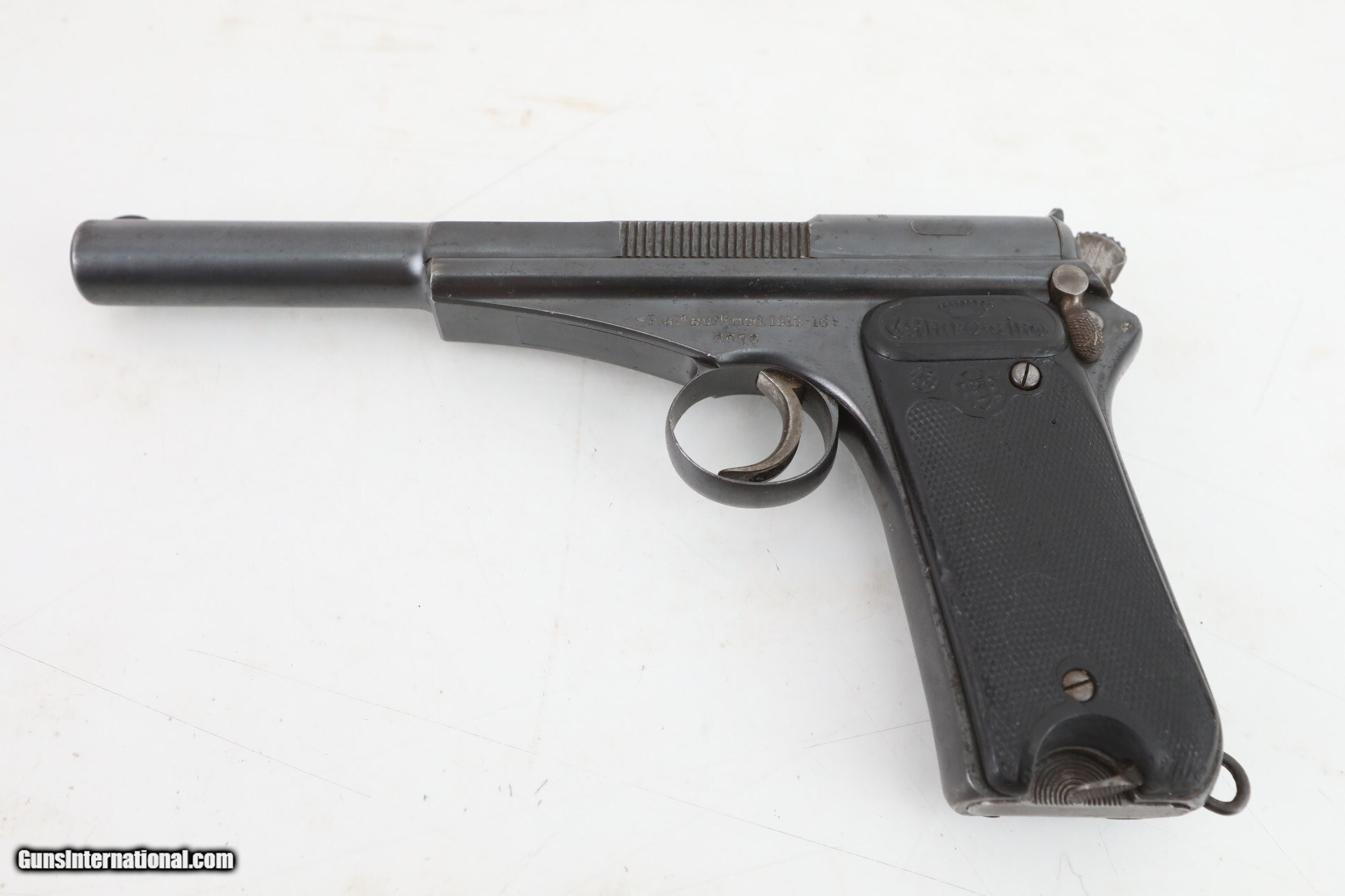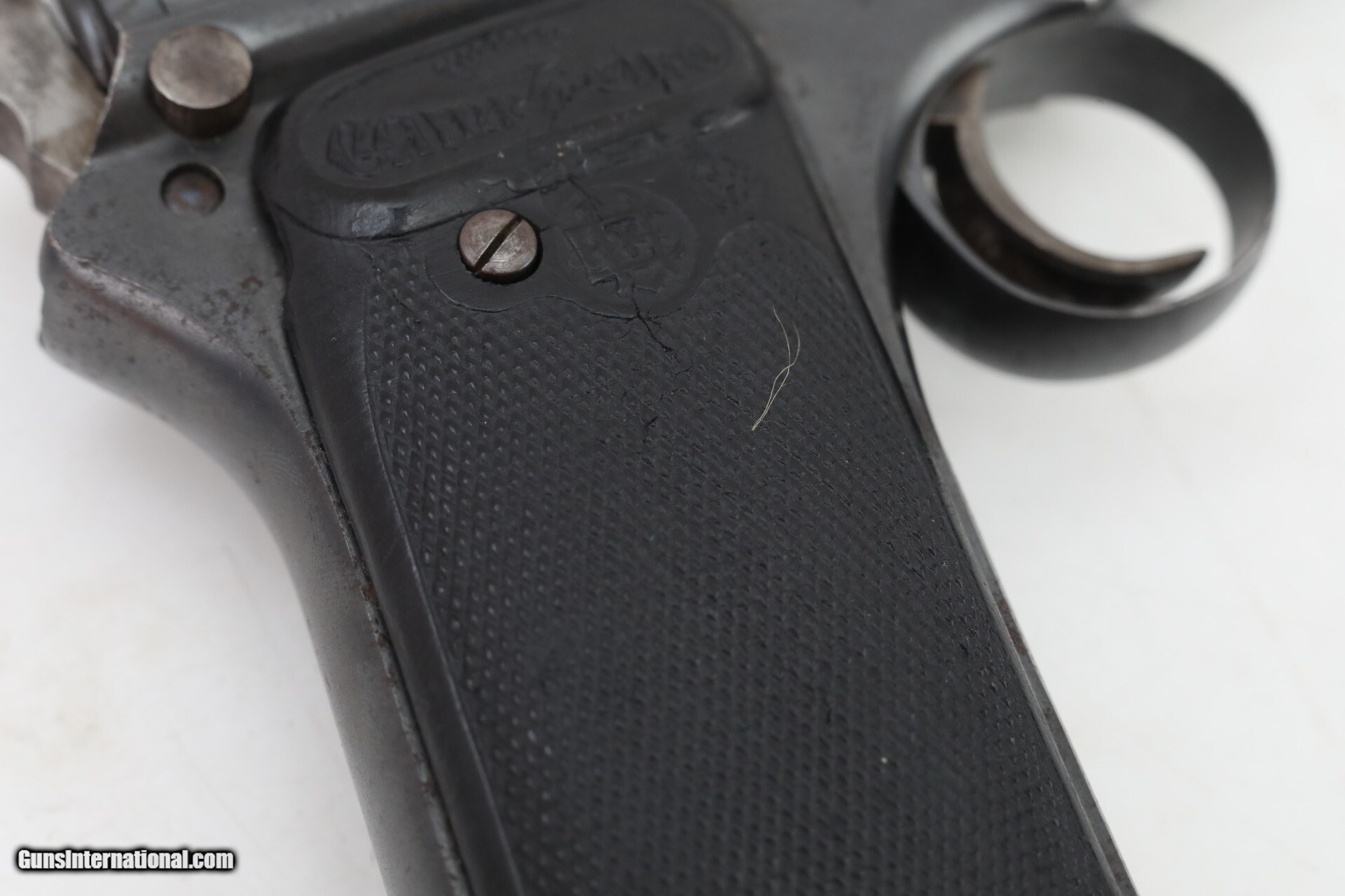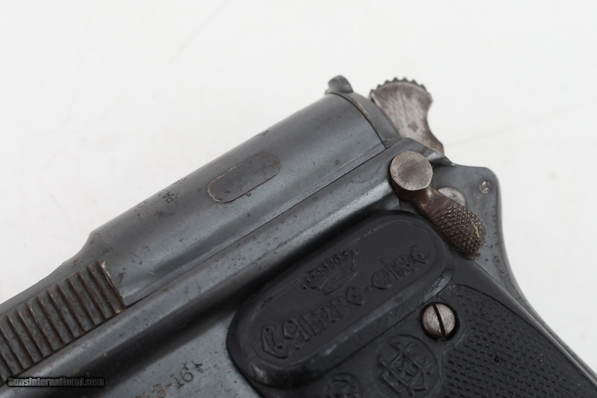 Description: Manufacturer: Astra Model: Campo Giro Modelo 1913-16 Action: Semi Caliber: 9mm Largo Capacity: 8 Serial: 6016 Barrel: 6.5 inches Finish: Original Blue Stock/Grips: Pressed Horn This is an Astra (Esperanza y Unceta) Campo Giro 9mm Largo Modelo 1913-16 Pistol. This is the second improved model of this pistol. The mag catch has been moved to the lower left side of the grip. The safety is improved, but still in the same location. The bolt matches the frame, other parts are hidden and would require disassembly. The correct style magazine does not match, which is not unusual for this model. The pressed buffalo horn grips are in very condition for the age of this pistol. Bore is used but still nice, just worn a bit. The blue finish is original, and not refinished. there are some dings and spots, but nothing really detracting from the overall appearance. This pistol is above average condition for Campo Giro 1913-16 Models. This Pistol is not often seen today, hard to find in this condition. More pictures available upon request. Check out the pictures and you will see this is a great find! Everything is shown in the pictures of our listings....boxes, extras, mags, paperwork. If it is not shown in the pictures we do NOT have it. Nearly all of our sales are consignment listings. If you like how our items are presented and would like us to handle your sales please contact us.....click on " Ask seller a question" and send me a message. We have very competitive rates...ONLY 10% for consignment sales. We have a long history on Gun , and all items are insured that are in our possession. We travel to pick up collections and we send boxes with return labels to make getting your items to us as easy as possible. Curio/Relic: Yes Handgun Caliber: 9mm Largo (9mm Bergmann-Bayard, 9x23mm Largo) Manufacturer: Astra Model: Campo Giro 1913-16 Serial Number: 6016 Barrel Length: 6.5 Condition: very good Metal Condition: very good above average Bore Condition: Slightly used strong rifling Manufacture Date: 1917 Price: $3,500.00 Contact Seller |
