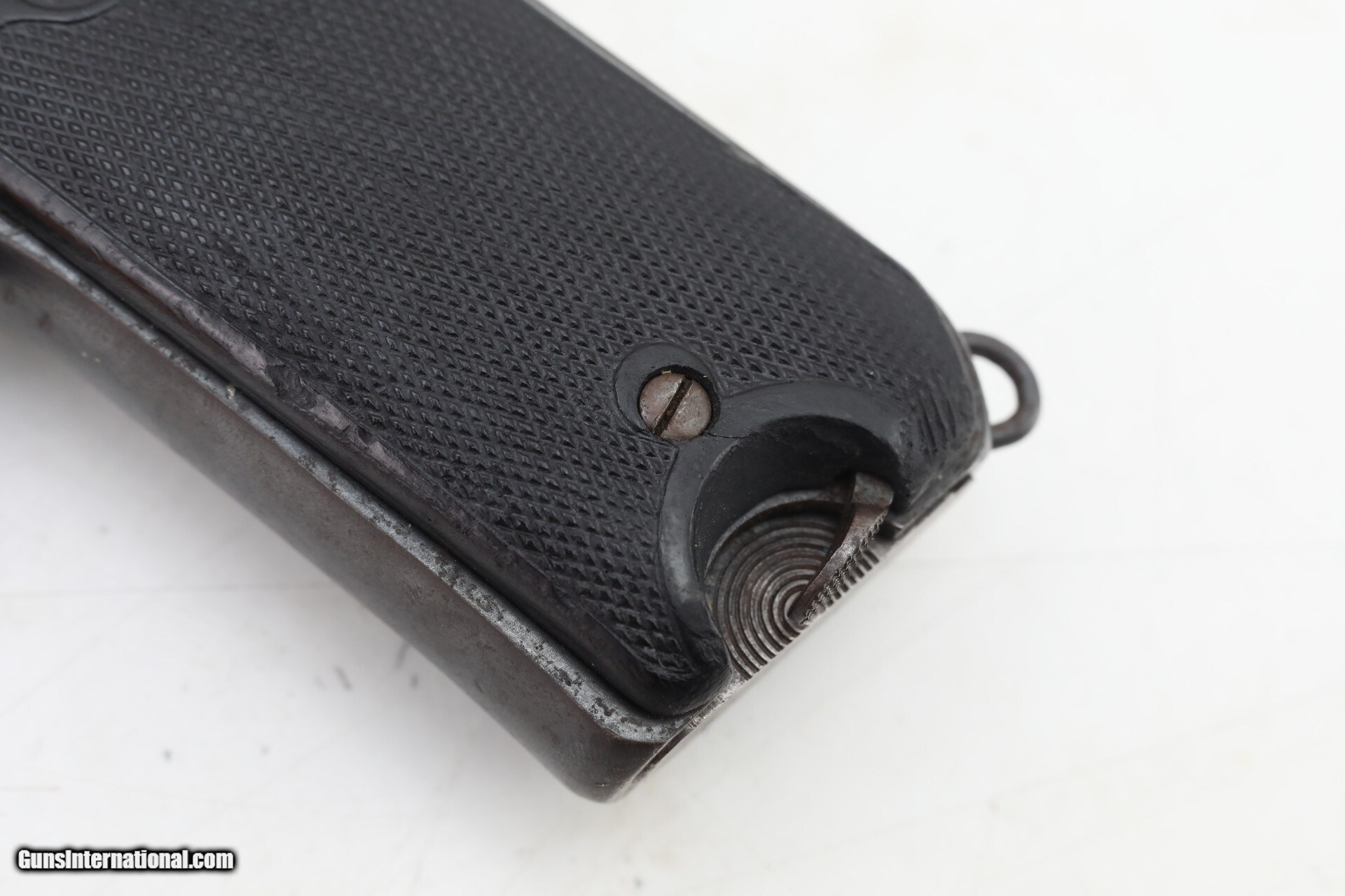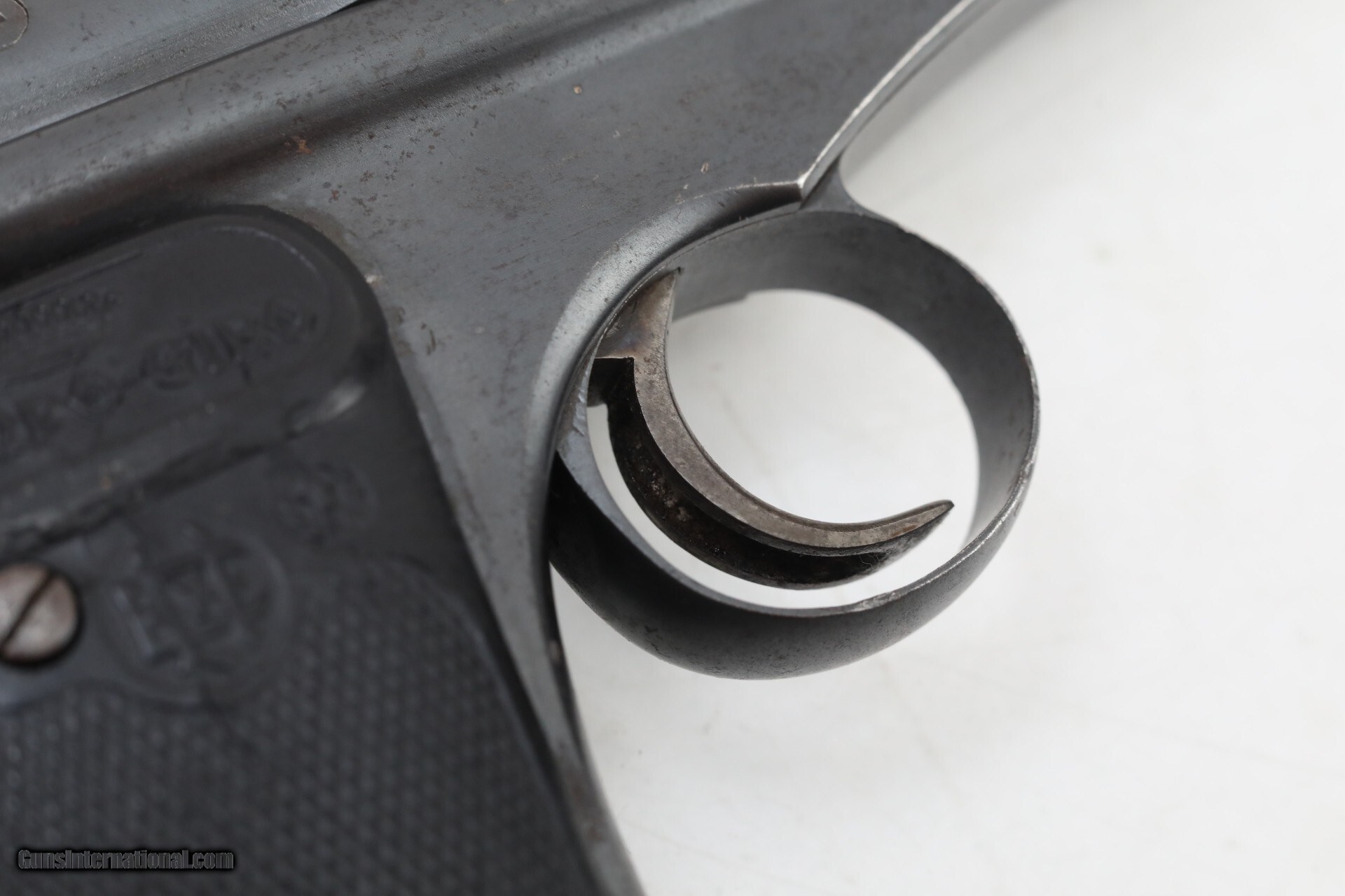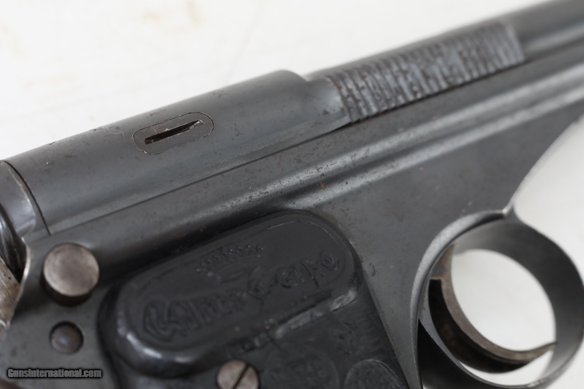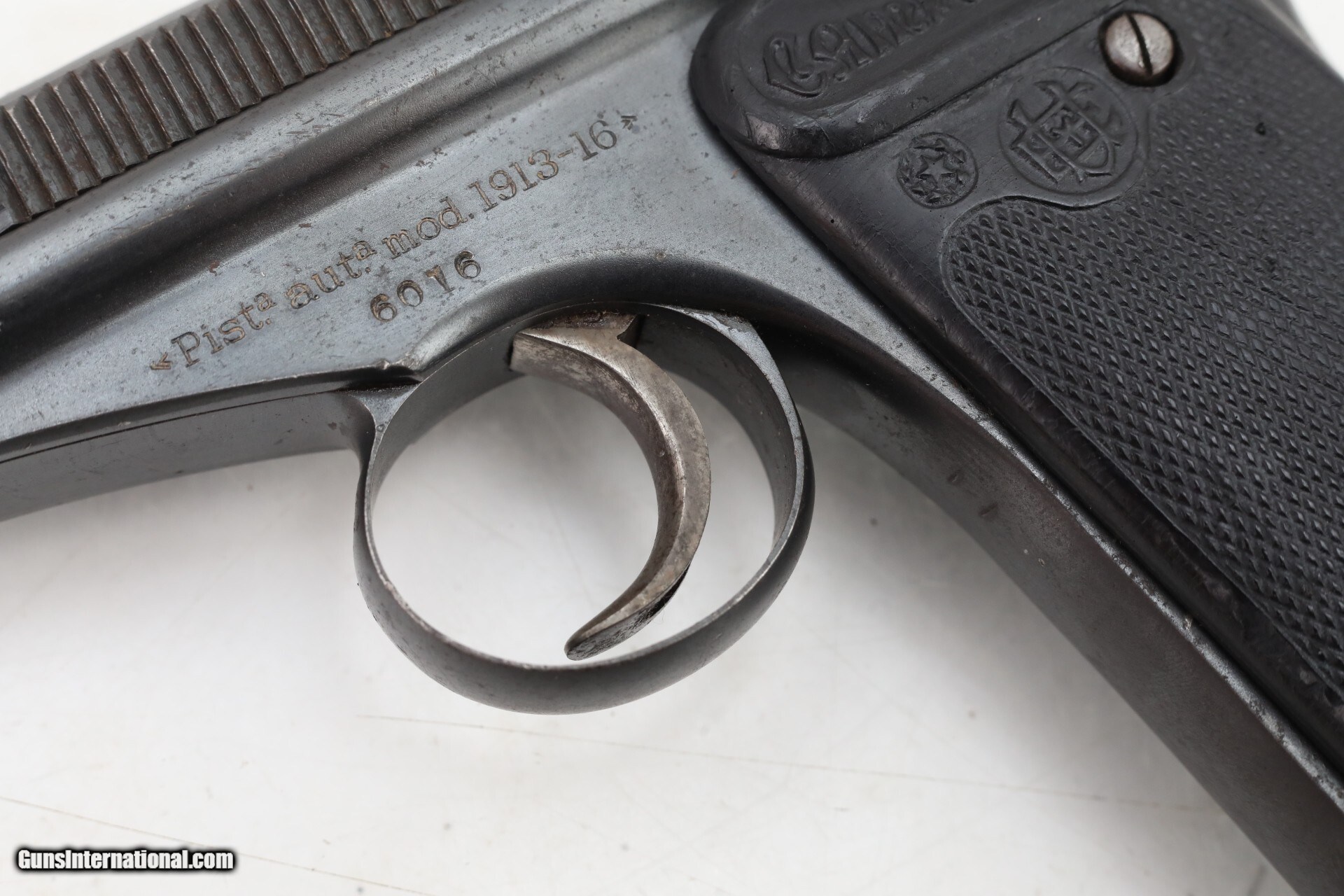 Description: Manufacturer: Astra Model: Campo Giro Modelo 1913-16 Action: Semi Caliber: 9mm Largo Capacity: 8 Serial: 6016 Barrel: 6.5 inches Finish: Original Blue Stock/Grips: Pressed Horn This is an Astra (Esperanza y Unceta) Campo Giro 9mm Largo Modelo 1913-16 Pistol. This is the second improved model of this pistol. The mag catch has been moved to the lower left side of the grip. The safety is improved, but still in the same location. The bolt matches the frame, other parts are hidden and would require disassembly. The correct style magazine does not match, which is not unusual for this model. The pressed buffalo horn grips are in very condition for the age of this pistol. Bore is used but still nice, just worn a bit. The blue finish is original, and not refinished. there are some dings and spots, but nothing really detracting from the overall appearance. This pistol is above average condition for Campo Giro 1913-16 Models. This Pistol is not often seen today, hard to find in this condition. More pictures available upon request. Check out the pictures and you will see this is a great find! Everything is shown in the pictures of our listings....boxes, extras, mags, paperwork. If it is not shown in the pictures we do NOT have it. Nearly all of our sales are consignment listings. If you like how our items are presented and would like us to handle your sales please contact us.....click on " Ask seller a question" and send me a message. We have very competitive rates...ONLY 10% for consignment sales. We have a long history on Gun , and all items are insured that are in our possession. We travel to pick up collections and we send boxes with return labels to make getting your items to us as easy as possible. Curio/Relic: Yes Handgun Caliber: 9mm Largo (9mm Bergmann-Bayard, 9x23mm Largo) Manufacturer: Astra Model: Campo Giro 1913-16 Serial Number: 6016 Barrel Length: 6.5 Condition: very good Metal Condition: very good above average Bore Condition: Slightly used strong rifling Manufacture Date: 1917 Price: $3,500.00 Contact Seller |