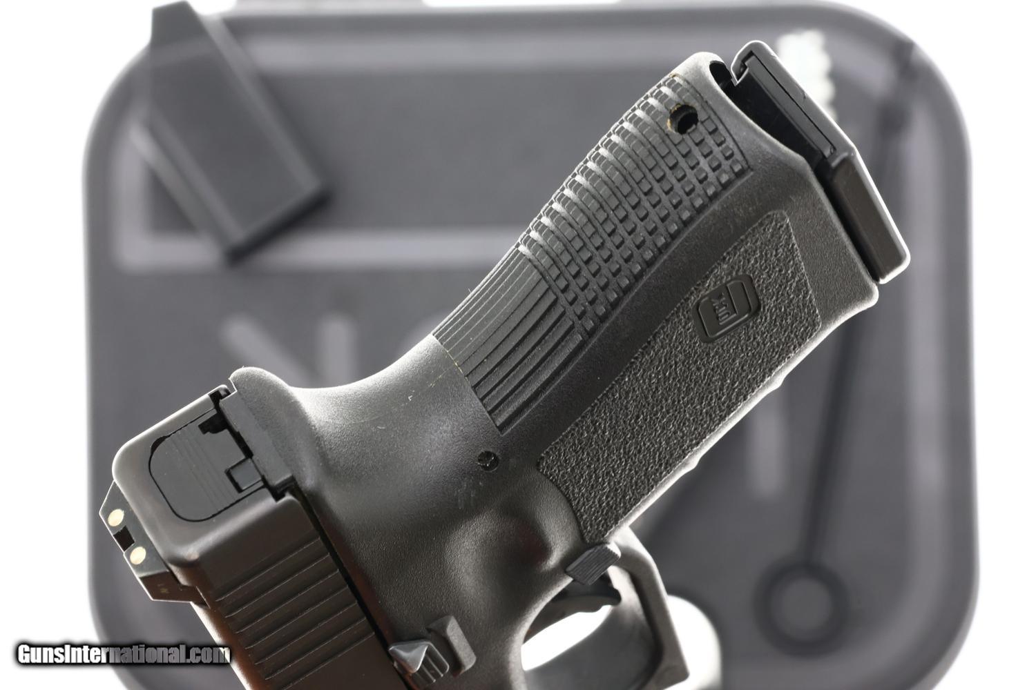 EXC+ overall showing minimal handling wear consistent with light professional carry/limited use. Slide retains 99% of its original Tenifer finish with only minor holster wear at the muzzle and high edges. Comparable condition frame. Bore is mirror bright with sharp rifling. All mechanical functions operate correctly with typical Glock trigger pull. Factory case shows light storage wear, all accessories in excellent condition. Instruction booklet is wrinkled in a manner suggesting pervious water damage. A wonderful example of a Swiss police contract Glock with spare magazine, accessories, in correct case.