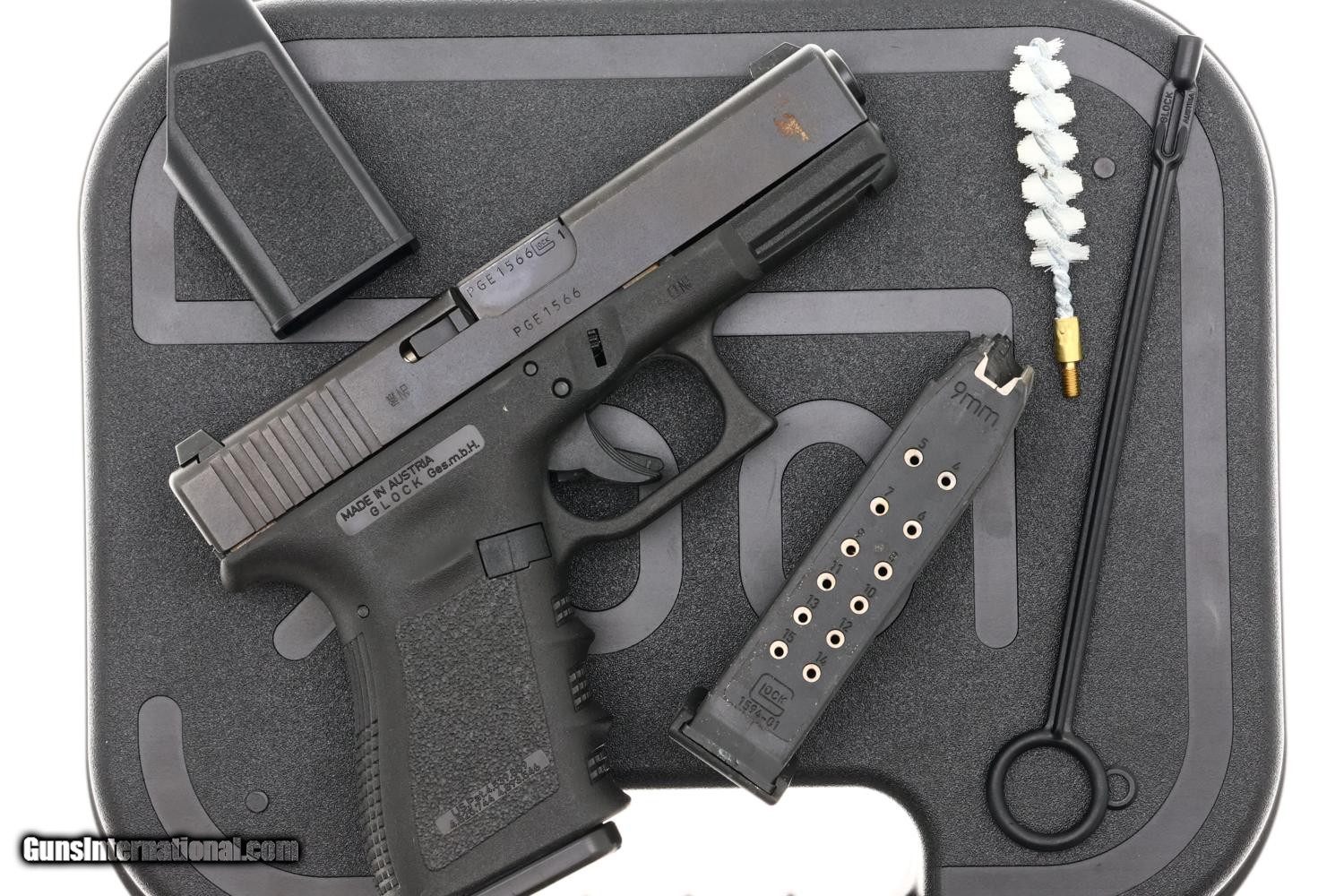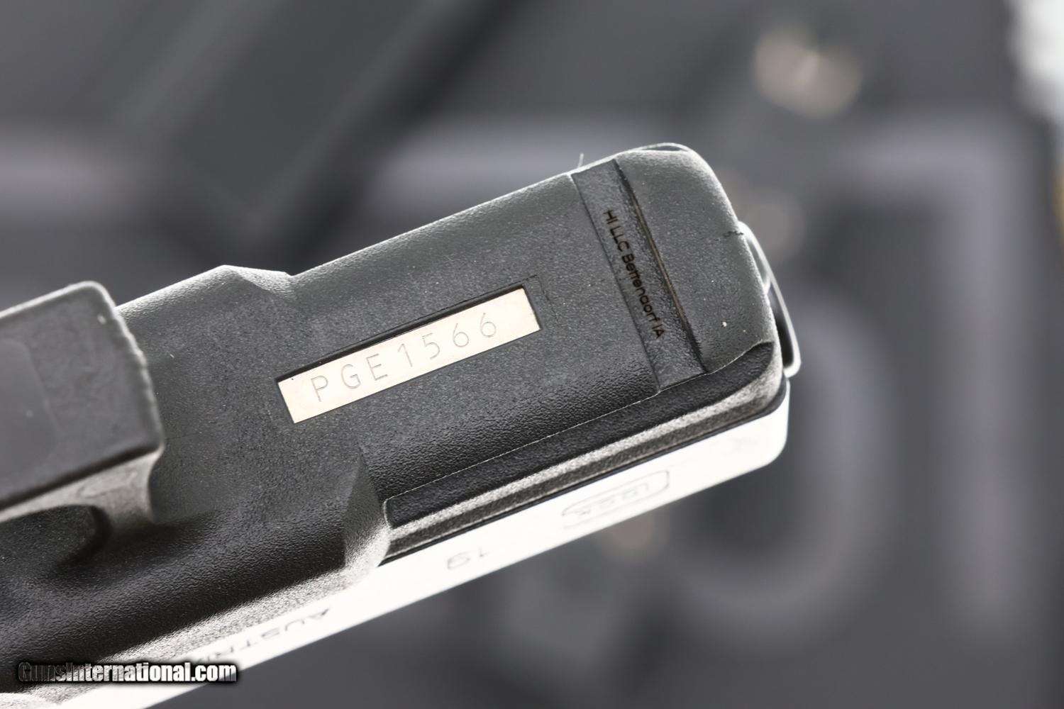 Standard configuration Glock 19 Generation 3 compact pistol chambered in 9x19mm with a 4.5" barrel and polymer frame with integral accessory rail. Left side of slide marked "GLOCK 19 AUSTRIA 9x19." Geneva Police markings on the right side of the slide, with matching serial number PGE1566 on barrel, slide, and frame. Standard Glock sighting system with white dot night sight. Factory trigger with integrated safety, standard magazine release, and slide stop lever. Textured grip frame with finger grooves characteristic of Generation 3 models. Complete with original, but unmarked, Glock hard case, one spare magazine, loader, factory cleaning rod with separate white bristle brush. Multi-language instruction booklet. This pistol represents a desirable Swiss police contract example, issued to the Geneva Canton police force (Police de Genève).