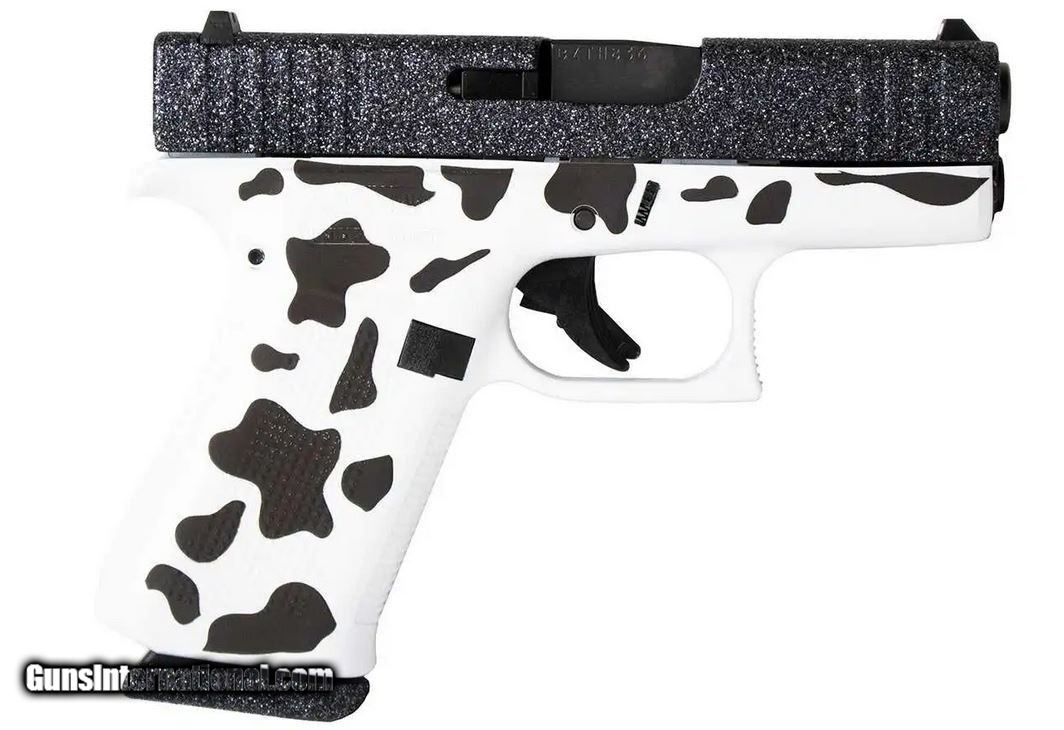 Description: Guns Listing ID: 493515 Glock G43X 9mm, 3.41\" Barrel, Cow Print with Black Glitter, 10+1 Rounds Designed for comfort, The G43X combines a compact-size grip length, a built-in beaver tail and a subcompact-slim slide for a comfortably balanced, versatile grip that´s ideal for a variety of users. The frame incorporates elements of the Gen5 and Slimline series such as the short trigger distance, a frame with a built-in beavertail, a reversible magazine catch and the incredibly accurate, match-grade GLOCK Marksman Barrel (GMB) and precision-milled front serrations. Manufacturer: GLOCK Model: G43X Caliber Info: 9MM LUGER (9x19 PARA) Condition: new Barrels: 3.41" BARREL Action: SEMI AUTOMATIC Finish: COW PRINT Price: $589.99 Contact Seller |