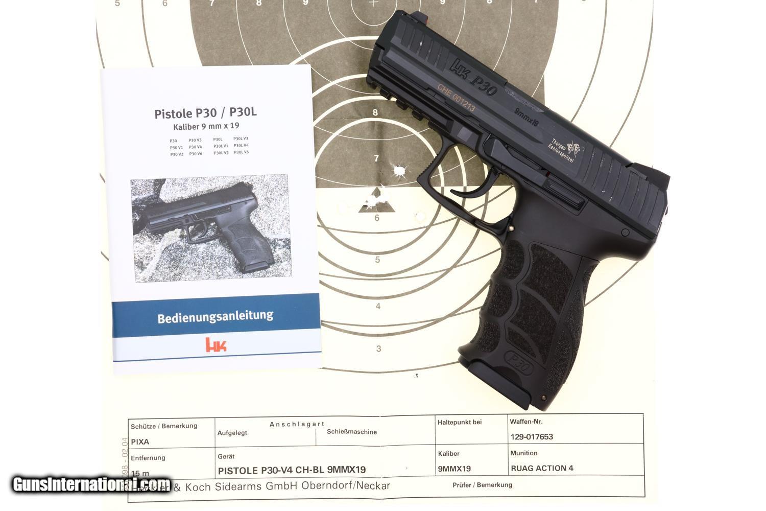 Standard configuration H&K P30, DAO, 9mmP, with usual H&K markings except for the Thurgau canton shield on the left side of the slide that has red and white dotted sight highlights. Matching barrel and slide. Owners manual warning molded on lower trigger guard. Ergonomic grips with finger grooves and textured panels, the left panel marked with the encircled P30. Complete with two original high capacity magazines, each with a red follower and zippered spine. Both marked with 12 indicator holes numbered 4-15. Complete with a numbered H&K black plastic case compartmentalized for the pistol, spare magazine, and other accessories (missing). Under the foam is a matching test target and instruction booklet for the Pistole P30/P30L/P30SK. WILL NOT SHIP TO RESTRICTED STATES.