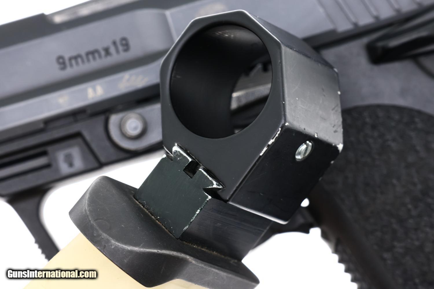 VG+ original finish with sharp edge wear consistent with a police pistol that has seen moderate use. Night sights no longer luminous. Comparable condition frame and magazine body/flashlight extension. Mirror bore. Correct manual mechanics. A very unusual H&K USP Pistol, made for the Swiss Bern Police, fitted with an extremely scarce extended magazine with flashlight adapter.