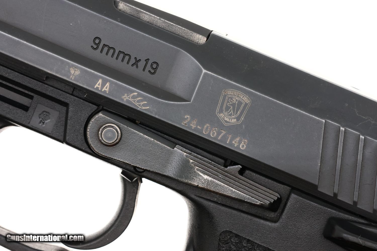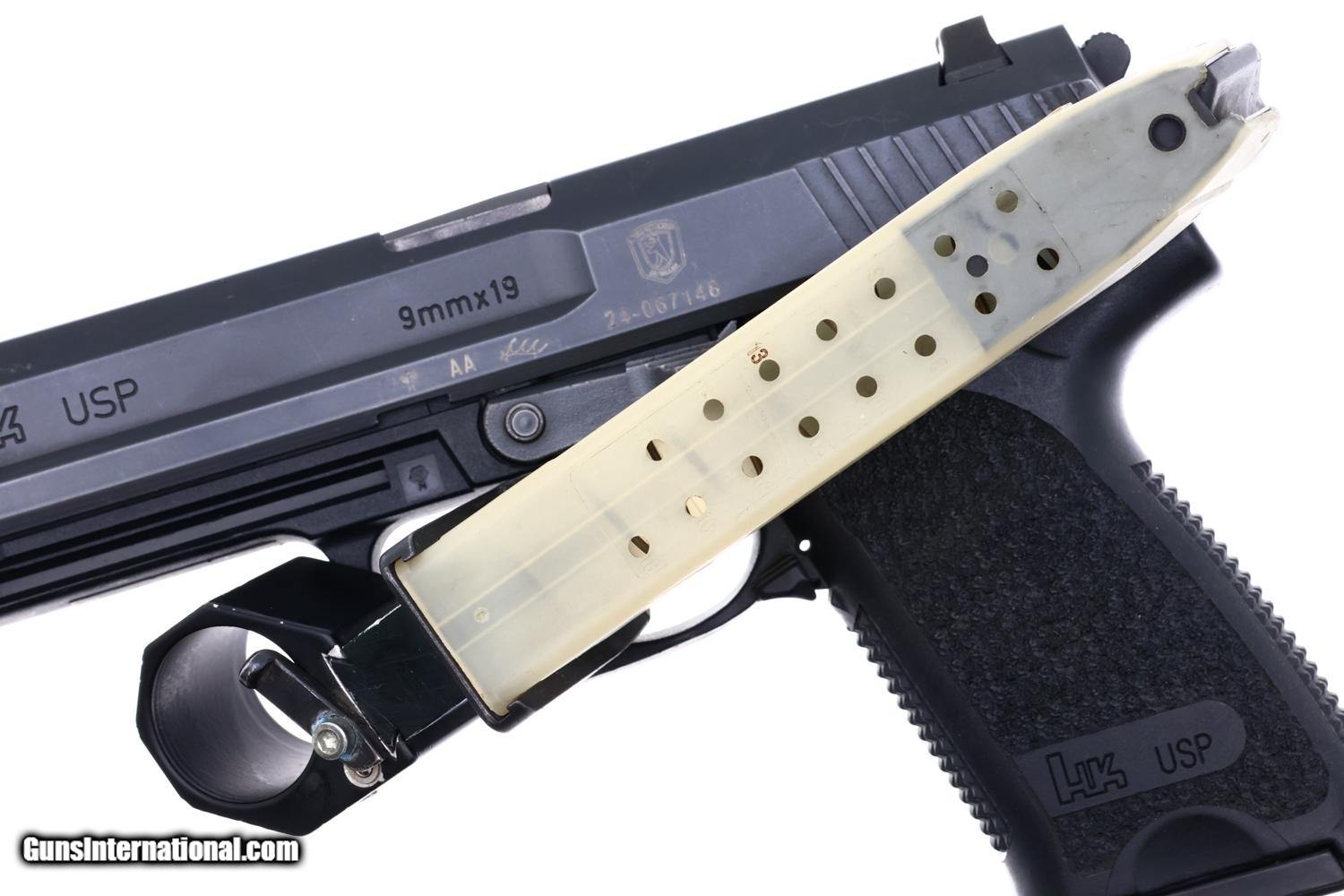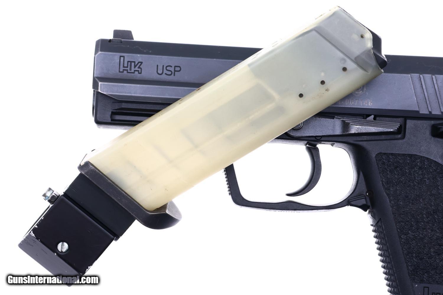 Standard configuration H&K USP Pistol with drift adjustable front and rear night sights. Left side of slide with the manufacturer and model reference followed by the proofing, AA year code, and Bern Police Logo surmounting the serial number. Right side of exposed barrel hood marked H&K, caliber, and SN, the later repeated on the forward frame insert. Molded warning under trigger guard. Complete with original magazine and translucent magazine, the spine drilled and marked for 18 shot capacity fitted with special floorplate/extension that slips into a flashlight adapter.