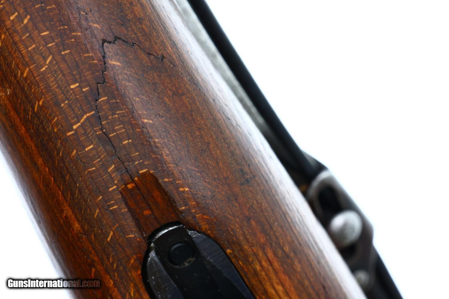 Description: Synopsis: The Erma K98k is a WWII German military rifle from 1941 in 8mm caliber, with all matching serial numbers, a laminated stock, and a mirror-bright bore. Description: Standard configuration early-war Mauser K98k, made by Erma with chamber code ax/41, SN: 4761a, cal. 8mm, all visible serial numbers matching (cupped buttplate matched but marked bpr for the sub contractor Johannes Großfuß, Metall-und Lackierwaren), with laminated military stock, hooded, serrated ramp drift adjustable front sight and a tangent rear sight graded 1-20. Left side of the receiver marked with the full serial number and Mod. 98. A scattering of acceptance markings along sides of receiver, barrel, floorplate, and stock. All parts matched to the four digits of serial number, including barrel bands, tangent sight, all components of the bolt, trigger guard assembly/floorplate, and laminated stock. Cleaning rod present and unmarked. Complete with leather sling. Condition: VG+ original blue with sharp edge wear, thinning of the floor plate and trigger guard, and fine flecks of scattered oxidation as one might expect from a military rifle that may have seen use throughout WWII. Laminated stock in comparable condition, never sanded with raised grain, a hairline crack behind tang as carefully photographed. Mirror bright bore. Correct manual mechanics. A high condition and all-matching Erma K98k rifle with an easily repairable crack in stock. Curio/Relic: Yes Manufacturer: ERMA Model: K98K Serial Number: 4761a Caliber Info: 8mm Condition: VG Price: $2,995.00 Contact Seller |