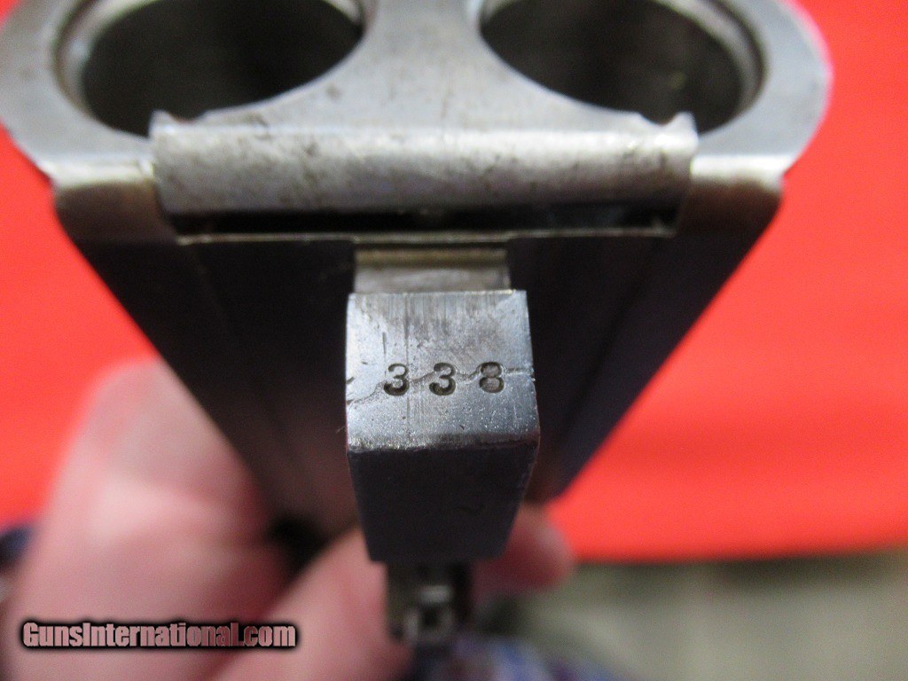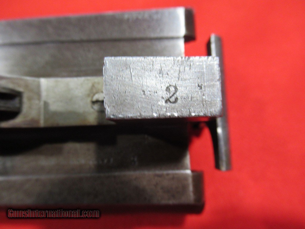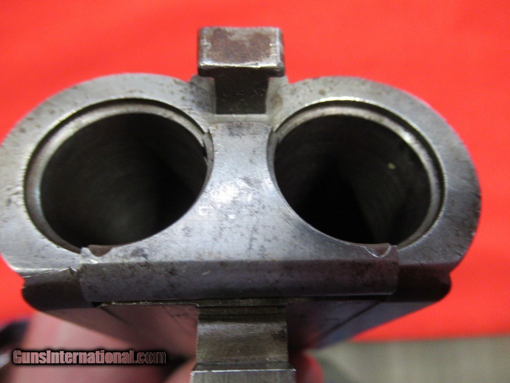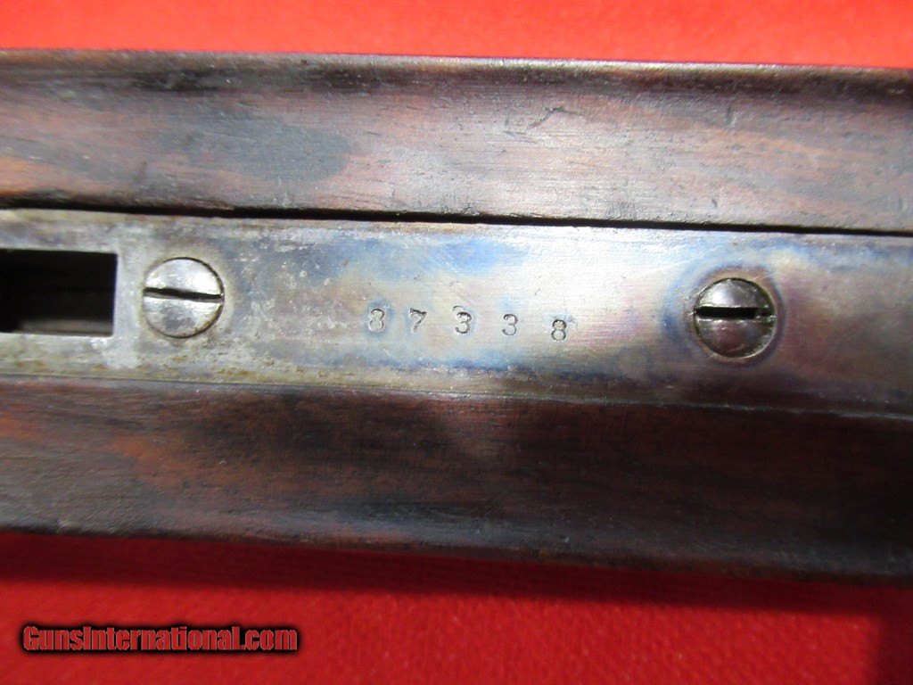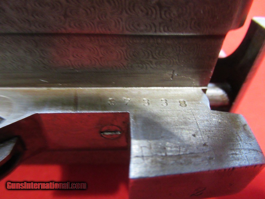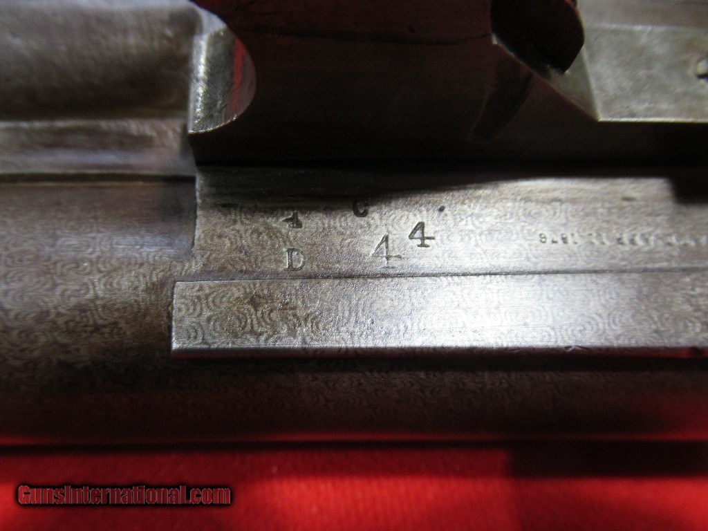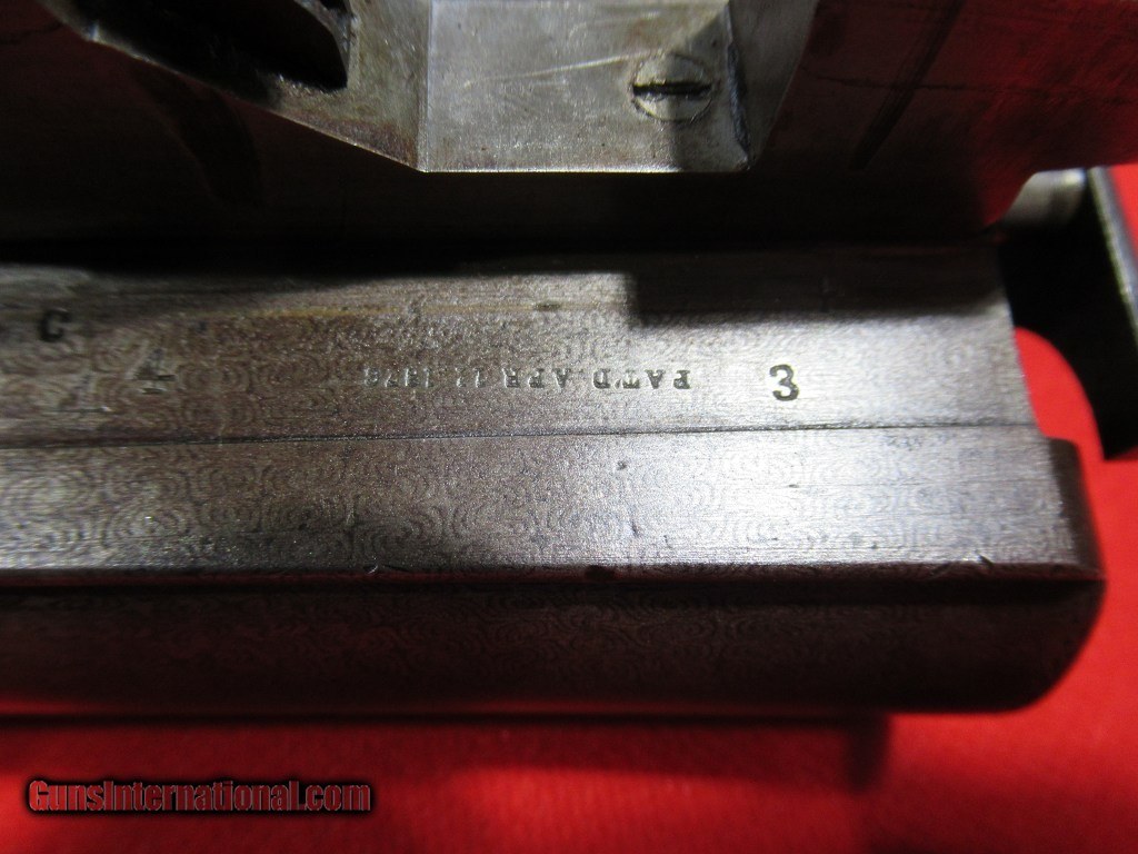 Description: 1897 Mfg Parker Grade 3 with 30" damascus barrels. The right barrel measures.738" - .713" and the left barrel measures .737" - .694". Stock is 1 7/8" x 3" x 14 1/8" with a skeleton butt plate. Weight is 7 pounds 11 ounces. This is a #2 frame gun with double triggers, extractors, capped pistol grip, splinter forearm. The stock has been refinished as have the barrels. Traces of case color in the protected areas. Price: $1,795.00 Contact Seller |